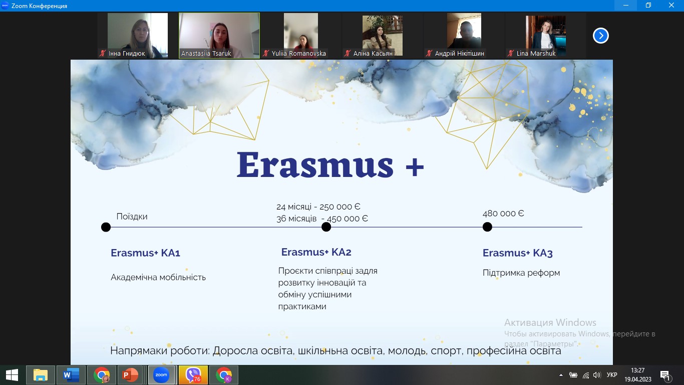 Під час майстер-класу учасники дізналися про роботу Folkuniversitet, Erasmus +, основні аспекти роботи над європейськими проєктами, два сценарії фінансування проєктів в рамках програми Erasmus +, як здійснюється аналіз надходження фінансів до бюджету організації, звітування в Mobility tool, формування фінального звіту, а також про платформу результатів проєкту. Анастасія Царук поділилася власним досвідом роботи над проєктами в рамках програми Erasmus +, що особливо зацікавило здобувачів.