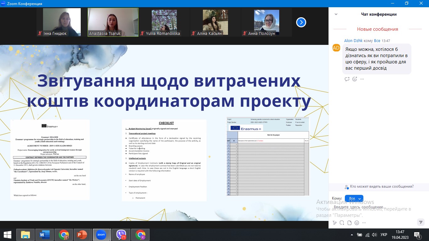 19 квітня 2023 року кафедрою фінансів, з використанням засобів онлайн-платформи Zoom, було проведено майстер-клас на тему «Фінансування європейських проєктів в рамках програми Erasmus +», спікером на якому виступила Анастасії Царук, проєктний менеджер відділу міжнародного співробітництва, Folkuniversitet, Upsala, Sweden. У майстер класі взяли участь здобувачі освітніх ступенів «молодший бакалавр», «бакалавр» та «магістр» обліково-фінансового факультету спеціальності 072 «Фінанси, банківська справа та страхування» та науково-педагогічні працівники кафедри фінансів ВТЕІ ДТЕУ.