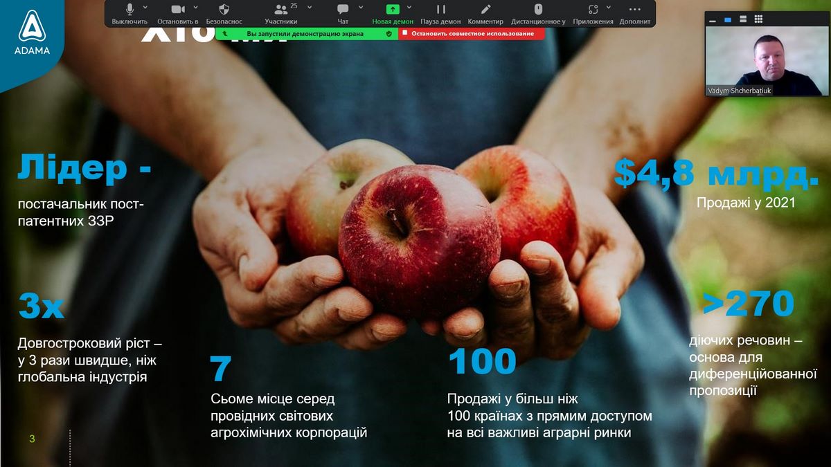 Вадим Щербатюк коротко висвітлив історію успіху та ефективності компанії від моменту створення (1945 р.) до сьогоднішнього етапу її розвитку, коли компанія здійснює продажі більше ніж у 100 країнах світу, має 60 дочірніх компаній у понад 45 країнах, утримує майже половину глобального обсягу продажів на ринках, що зростають.