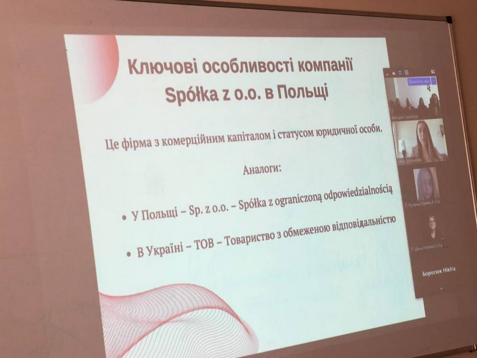 10 травня 2023 року відбулася зустріч студентів освітнього ступеня «магістр» ОП «Міжнародний бізнес», ОП «Економіка підприємства», освітнього ступеня «бакалавр» ОП «Міжнародний бізнес», ОП «Економіка бізнесу» з співвласницею ТОВ «Ariden», Варшава Польща. Поспілкувалися про особливості створення власного бізнесу в Польщі, розглянули основні кроки в реєстрації підприємства. Визначили перспективи співпраці українського бізнесу з європейськими компаніями. Студенти жваво дискутували щодо вибору умов поставки українських товарів у Польщу, оформлення митних документів та ролі міжнародного бізнесу у відбудові економіки України.
