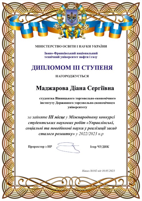 диплом ІІІ ступеня: Діана Маджарова – студентка 4 курсу бакалаврату з науковою роботою на тему «Молодіжне волонтерство як соціальний феномен: досвід України та Великої Британії», виконаною під науковим керівництвом канд. екон. наук, доцентки кафедри менеджменту та адміністрування Ірини Семенюк.
