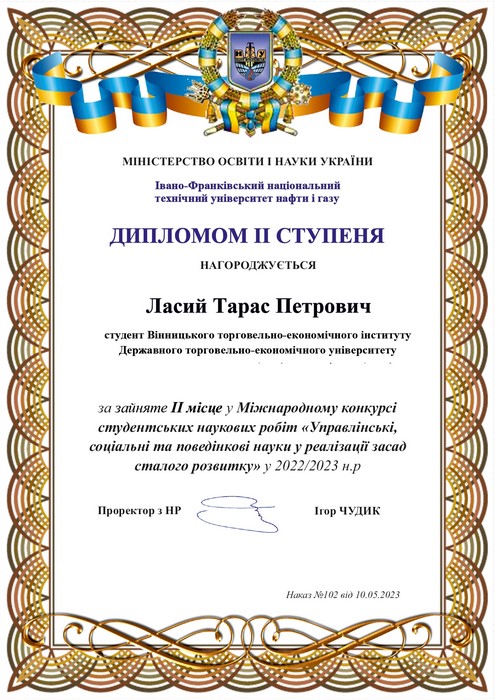 диплом ІІ ступеня: Тарас Ласий – студент 1 курсу магістратури з науковою роботою на тему «Публічний механізм розбудови безбар’єрного середовища в Україні», виконаною під науковим керівництвом канд. наук держ. упр., доцентки кафедри менеджменту та адміністрування Ірини Ніколіної;