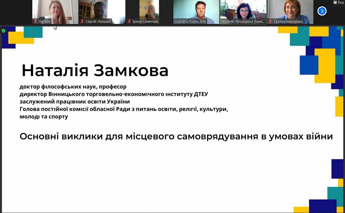 Tudor JIJIE, Associate Professor, Alexandru loan Cuza University, Romania, Iasi – «The use of socio-economic research for the development of municipalities». Володимир Мережко, кандидат економічних наук, заступник директора з міжнародної діяльності та стратегічного розвитку Вінницького торговельно-економічного інституту ДТЕУ, заслужений економіст України, директор Громадської організації «Вінницький Бізнес Клуб» - «Діяльність бізнесу в умовах війни».