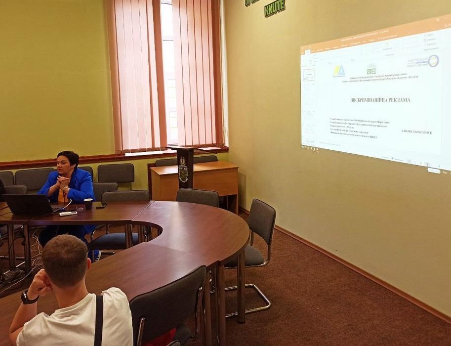 25 травня 2023 року школярі 8-В класу КЗ «Вінницький ліцей №10» завітали до ВТЕІ ДТЕУ на захід в межах дії Меморандуму про співпрацю. Для учнів професор кафедри маркетингу та реклами Альона Танасійчук провела практичне заняття «Дискримінаційна реклама». Мета заходу - формування соціальних та полікультурних компетентностей учнів, вміння аналізувати рекламні повідомлення, висловлювати власну думку та застосовувати надуті знання в конкретних життєвих ситуаціях.