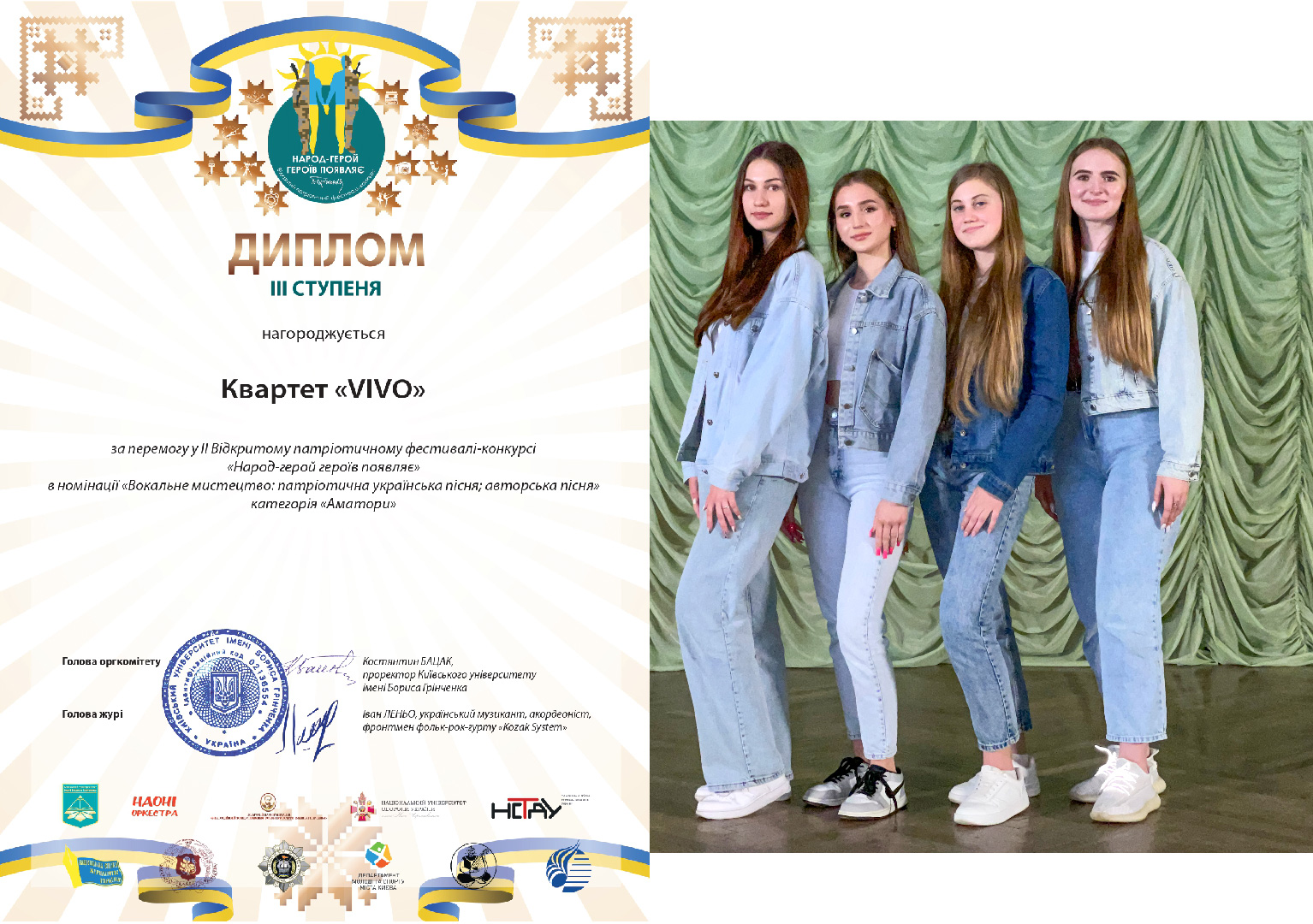 - Квартет «VIVO» (художній керівник Аліна Барановська) - Диплом III ступеня в номінації «Вокальне мистецтво: патріотична українська пісня; авторська пісня», категорія «Аматори»;