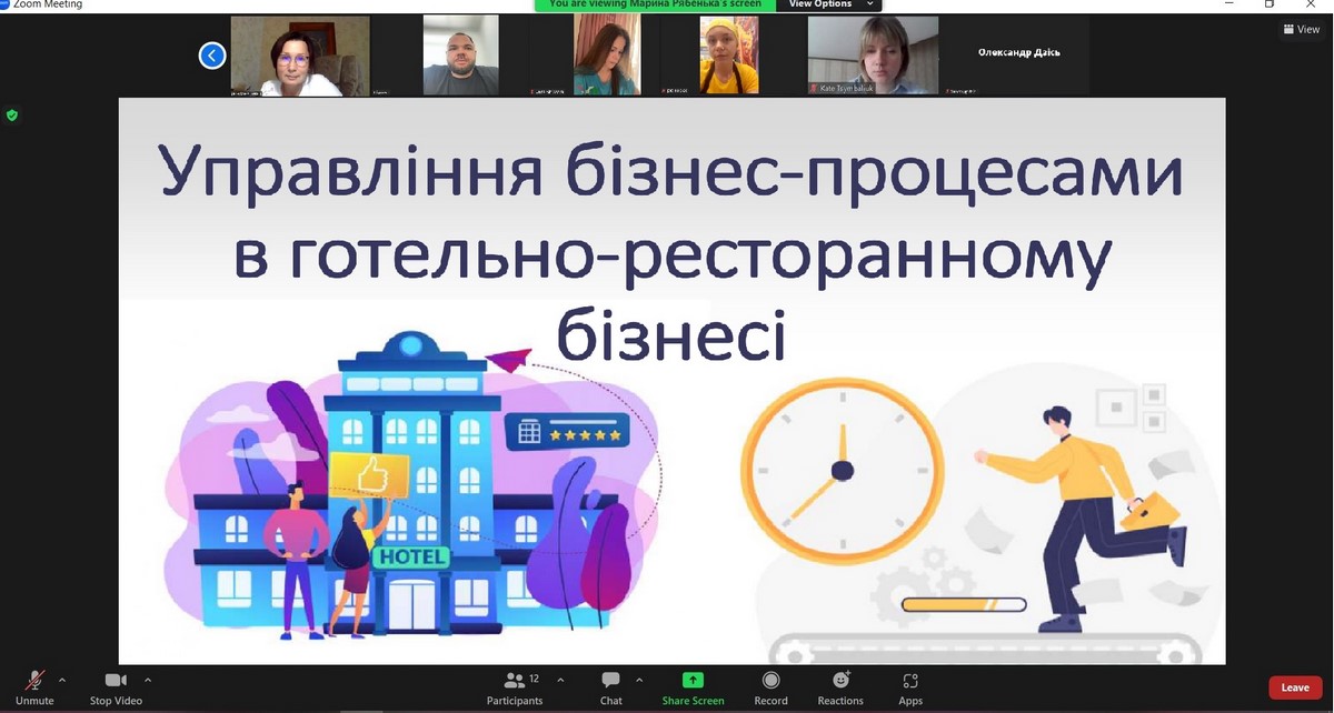 Лекцію було проведено в рамках вивчення освітньої компоненти «Управління бізнес-процесами в готельно-ресторанному бізнесі». У ході лекції розглянуто питання управління закладами ресторанного господарства в умовах сьогодення із врахуванням реалій ринку, війни та інших впливаючих чинників на управління бізнес-процесами. Велику увагу приділено актуальності сучасних підходів управління бізнес-процесами в ресторанному господарстві з метою конкурентного розвитку.