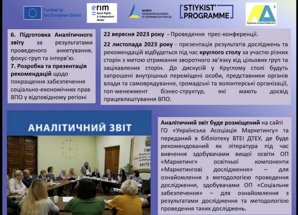 22 вересня 2023 року відбулася прес-конференція проєкту «Дослідження соціально-економічного становища та потреб ВПО у Вінниці та Вінницькій області», який реалізується Вінницьким відокремленим підрозділом ГО «Українська Асоціація Маркетингу» в партнерстві з ГО «Мережа громадських організацій підтримки ВПО в Україні». Дослідження здійснюється в рамках проекту «Екстрена підтримка громадянського суспільства та ЗМІ у відповідь на війну в Україні». Донор проекту Програма «Стійкість» - проект, який фінансується Європейським Союзом і впроваджується неурядовою організацією ЕRIM у партнерстві з Black Sea Trust, Інститутом економічних досліджень та політичних консультацій, Фондом "Східна Європа", Фондом "Дім прав людини" та Домом прав людини в Тбілісі.