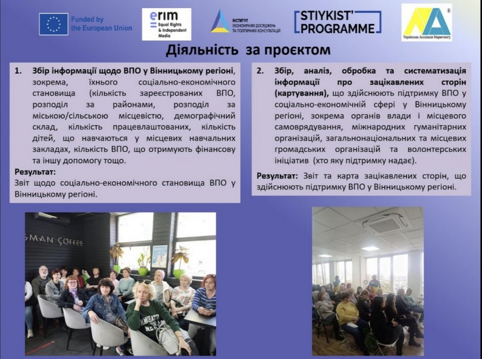 Проект спрямований на посилення стійкості та ефективності ОГС, що постраждали від війни, та суб'єктів громадянського суспільства, які постраждали від війни в Україні, включно з незалежними ЗМІ та правозахисниками. Завданням Дослідження є аналіз соціально-економічного становища ВПО у Вінницькій області, виявлення їхніх потреб та існуючих викликів у забезпеченні соціально-економічних прав ВПО у Вінницькій області з метою підвищення ефективності допомоги від держави, донорів та громад. Результати дослідження будуть широко оприлюднені та надані для ознайомлення всім зацікавленим особам.