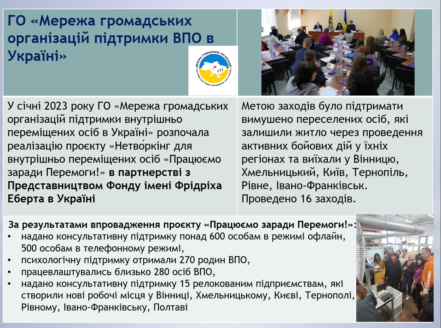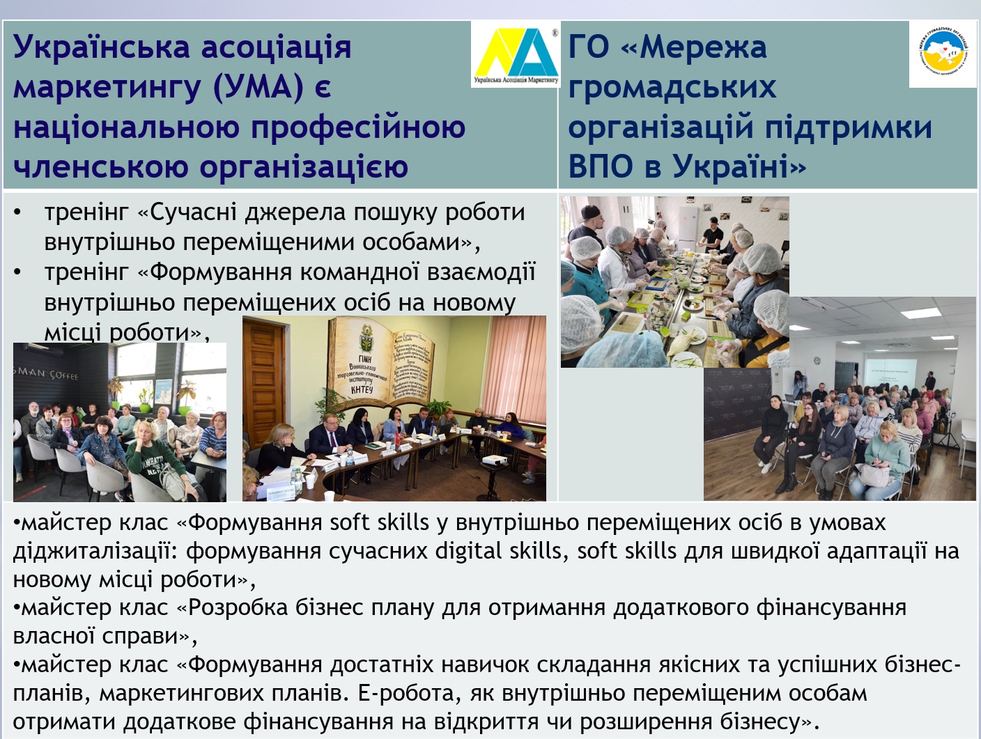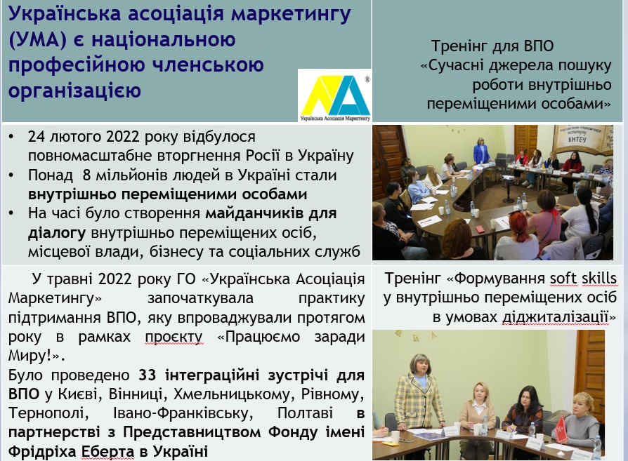 Другий фокус дискусії – як фахова спільнота може допомогти сьогодні громадянам України, що постраждали від загарбницької війни Росії, інтегруватися в нові громади, а зруйнованим закладам освіти – у відновленні освітнього процесу, дітям, які отримали психологічні травми – у відновленні психічного стану. Саме маркетологи, завдяки комунікаційним навикам та налагодженим зв’язкам, взяли на себе частину такої великої праці. На конференції було презентовано відповідну діяльність ГО «Українська Асоціація Маркетингу» та ГО «Мережа громадських організацій підтримки ВПО в Україні», визначено роль громадянського суспільства у відновленні різних процесів, які зазнали втрат після вторгнення росії на територію України. Відбулося жваве обговорення подальшої консолідації зусиль всіх членів для продовження такої роботи. Акцентовано увагу на тому, що всі активності з підтримки внутрішньо переміщених осіб Вінницьким відокремленим підрозділом «УАМ» відбувалися у співорганізації з Вінницьким торговельно-економічним інститутом ДТЕУ та представниками влади, органів самоврядування, бізнес-структур міста Вінниці.