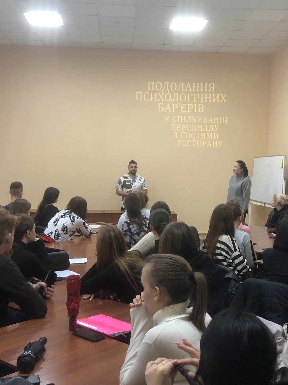25 жовтня 2023 року науково-педагогічні працівники кафедри туризму та готельно-ресторанної справи та здобувачі вищої освіти спеціальності «Готельно-ресторанна справа» взяли участь у тренінгу «Подолання психологічних бар’єрів у спілкуванні персоналу з гостями ресторану». Запрошеним спікером був Владислав Волинець, керуючий кав’ярнею «Cherry point». Спікер відзначив, що через професійне спілкування підвищується якість сервісу, а позитивна атмосфера стає невід’ємною частиною відвідування ресторану. Це визначає перше враження гостя, допомагає вирішувати проблеми, створює зручність та підвищує рівень довіри. Було визначено, що ресторанний бізнес – це не лише про смак, але й про сприйняття, взаємодію та комунікацію.
