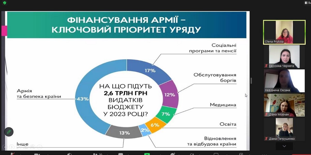 В роботі гуртка взяли участь студенти, що навчаються за спеціальностями ФБСС та ПУА. Найцікавішими були доповіді Кулик К. (ПУА-31д), Навідничої О. (ПУА-31д), Черниш А. (ФБСС-22д). В своїх доповідях студенти висвітлили особливості бюджетного процесу, податкової політики, фінансування потреб Збройних сил України, соціального захисту в сучасних надскладних умовах воєнного стану.