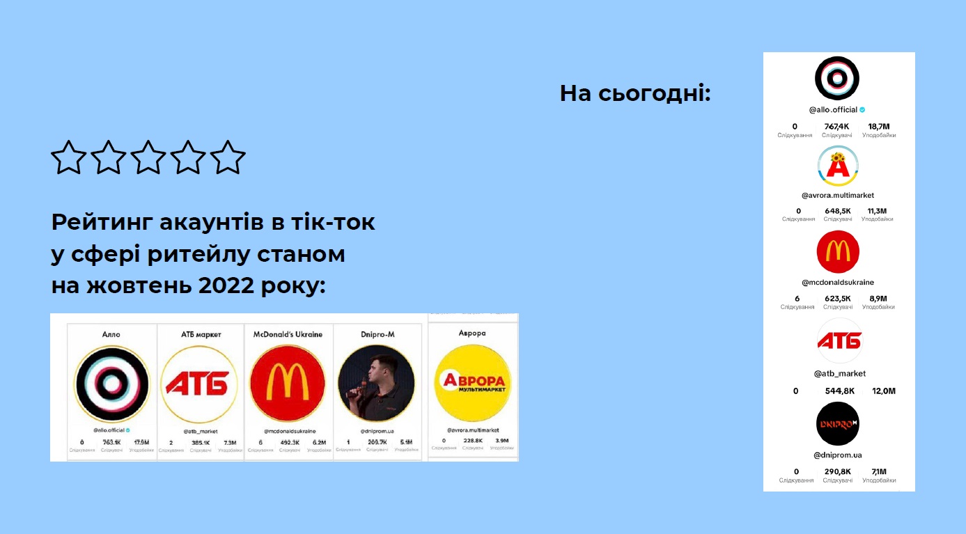 На вебінарі розглядали рейтинг акаунтів в Тік-Ток у сфері рітейлу станом на жовтень 2023 року, що таке «Тік-ток», які характеристики та можливості даного соцмедійного застосунку, як змінилася активність користувачів у «Фейсбуці» та «Instagram» з появою застосунку «Тік-ток».