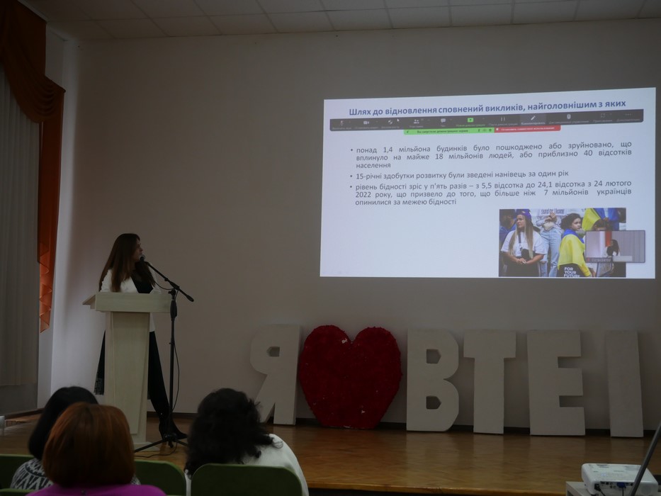 Соціальне підприємництво як інструмент розвитку громад в умовах подолання воєнних викликів. Доповідачка: Ірина Семенюк, кандидатка економічних наук, доцентка кафедри менеджменту та адміністрування ВТЕІ ДТЕУ, керівник Центру грантових проєктів, керівник ГО «Можливості. Сталий розвиток. Підприємництво Україна». Врахування цілей сталого розвитку міст та спільнот у повоєнній відбудові України. Доповідачка: Віта Бондар, асистент кафедри менеджменту та адміністрування ВТЕІ ДТЕУ, аспірантка кафедри публічного управління та адміністрування ДТЕУ, заступник голови правління ГО «Лабораторія суспільних змін».