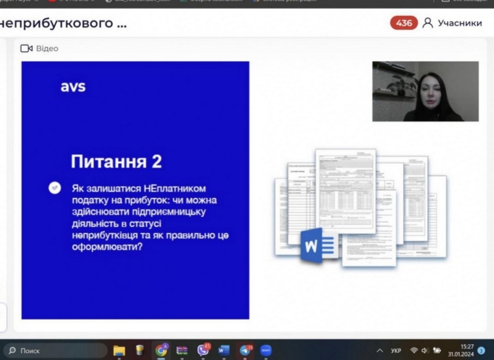 Протягом 29-31 січня 2024 року члени бізнес-школи ВТЕІ ДТЕУ, здобувачі вищої освіти та науково-педагогічні працівники брали участь у серії вебінарів «3 кроки як не втратити статус неприбутковості: річна звітність, діяльність поза статутом, співпраця з волонтерами» від AVS школи бухгалтерії.