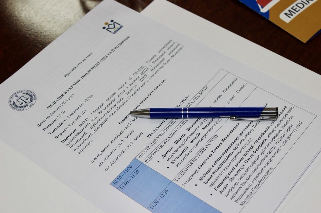 Захід вітальними словами відкрили Віталій Дончик, голова Вінницького окружного адміністративного суду та Віталій Кузьмишин, голова Сьомого апеляційного адміністративного суду. Учасники обговорили реалії та перспективи розвитку медіації в Україні, роль держави та юридичної спільноти в цьому процесі, основні виклики для активного впровадження та практичного застосування медіації.