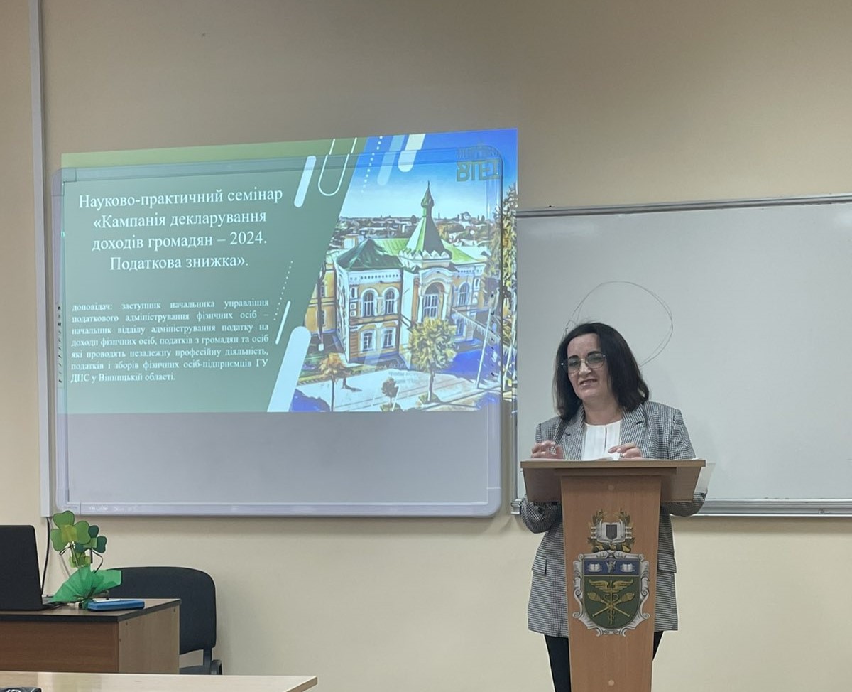 14 березня 2024 року відбувся науково-практичний семінар "Кампанія декларування доходів громадян - 2024. Податкова знижка". У якості запрошеного спікера виступила начальник відділу адміністрування податку на доходи фізичних осіб, податків з громадян та осіб які проводять незалежну професійну діяльність, податків і зборів з фізичних осіб-підприємців управління оподаткування фізичних осіб ГУ ДПС у Вінницькій області - Ірина Царук.