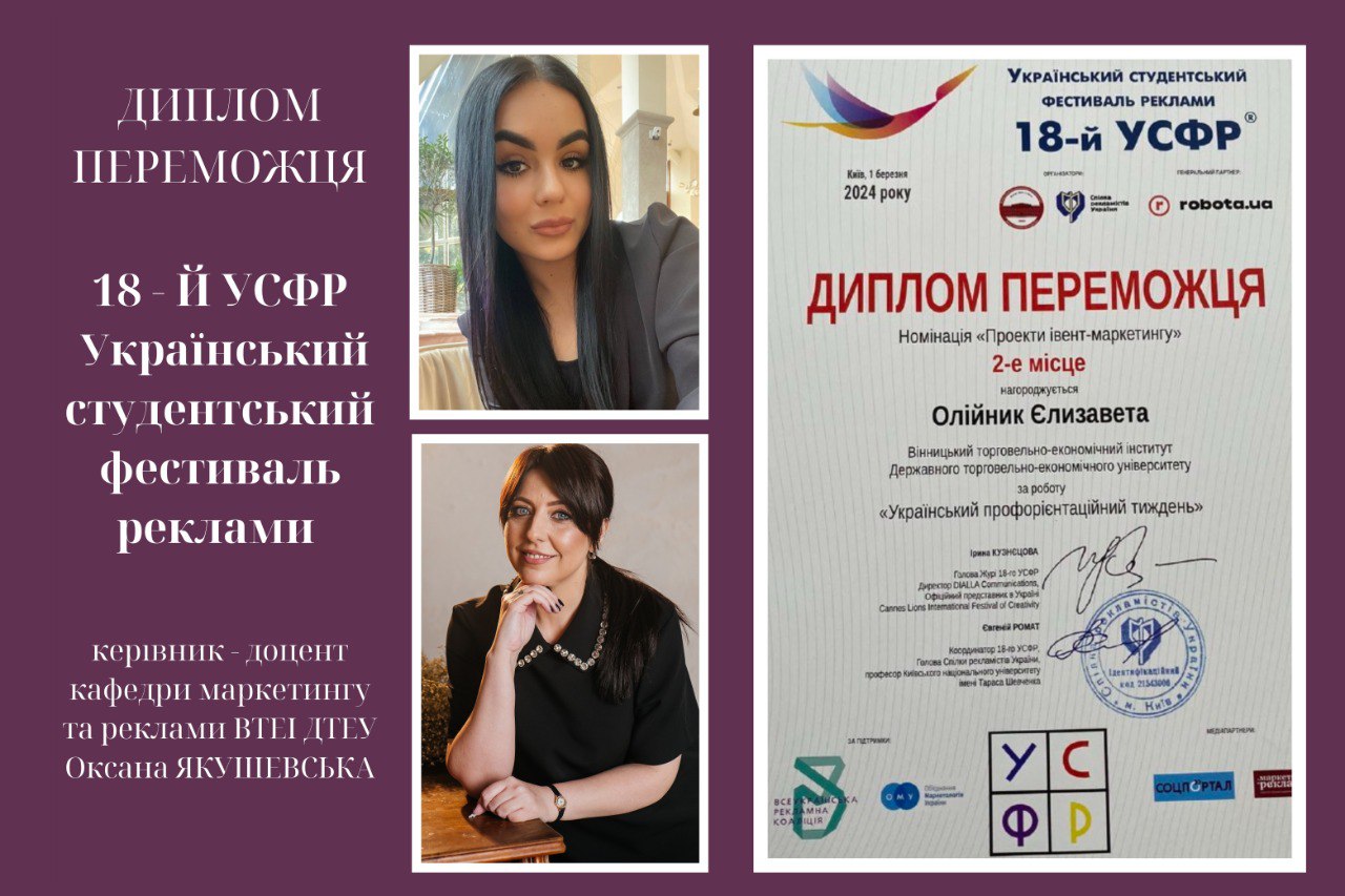 Єлизавета ОЛІЙНИК підготувала конкурсну роботу «Український профорієнтаційний тиждень» і у номінації «Проекти івент-маркетингу» посіла 2 місце (керівник – Оксана ЯКУШЕВСЬКА, доцент кафедри маркетингу та реклами).