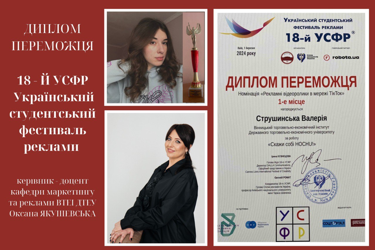 Вітаємо студенток ВТЕІ ДТЕУ та наукового керівника з перемогою у 18-тому Українському студентському Фестивалі реклами