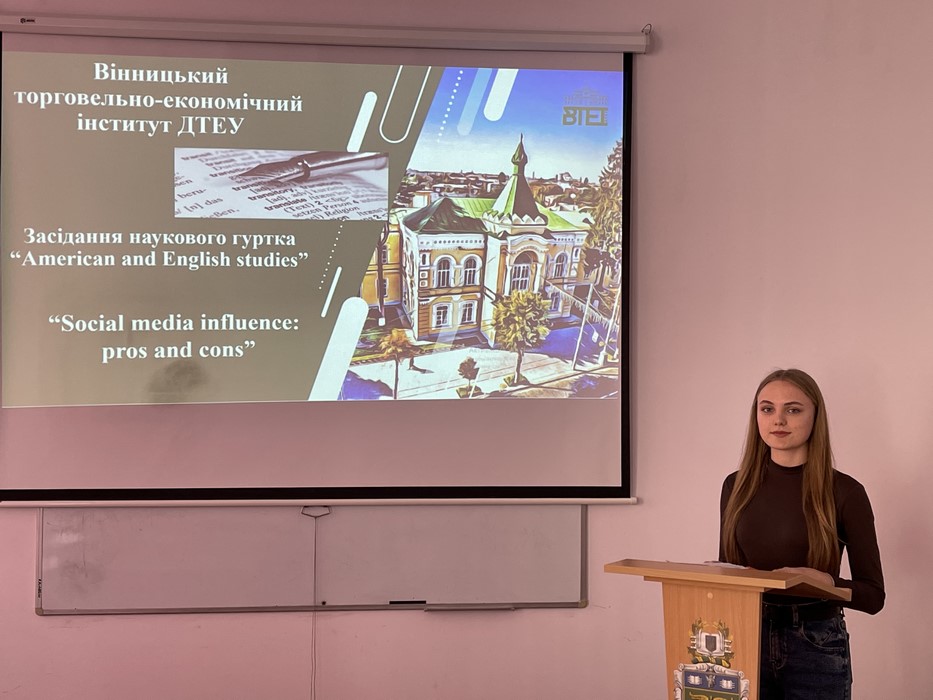 22 березня 2024 року кафедрою іноземної філології та перекладу Вінницького торговельно-економічного інституту ДТЕУ було проведено відкрите засідання наукового гуртка “American and English Studies”(керівники: Мацера Ольга, Паславська Інга) на тему “Social Media Influence: pros and cons”.