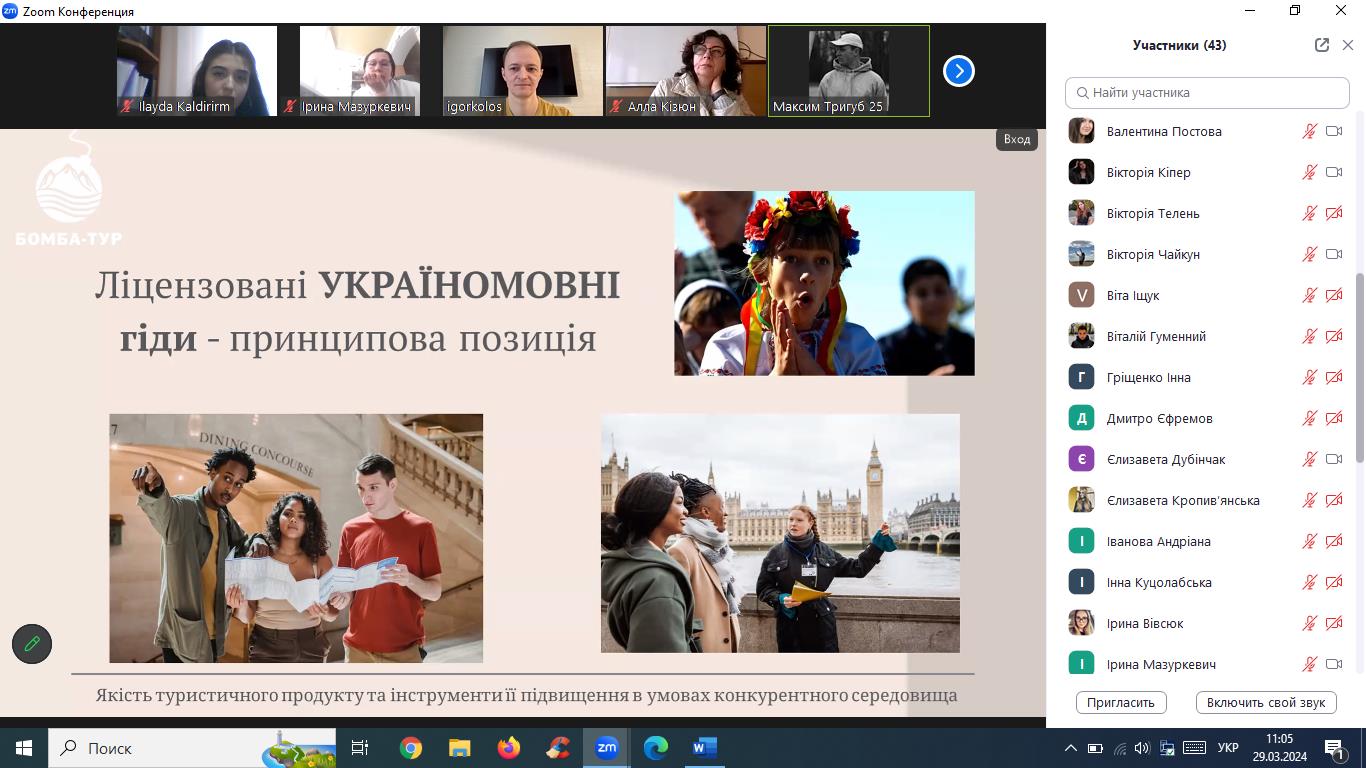 29 березня 2024 року для здобувачів вищої освіти за спеціальностями 242 «Туризм»/»Туризм і рекреація», 241 «Готельно-ресторанна справа» ОС «бакалавр», «магістр» проведено гостьову лекцію на тему «Якість туристичного продукту та інструменти її підвищення в умовах конкурентного середовища».