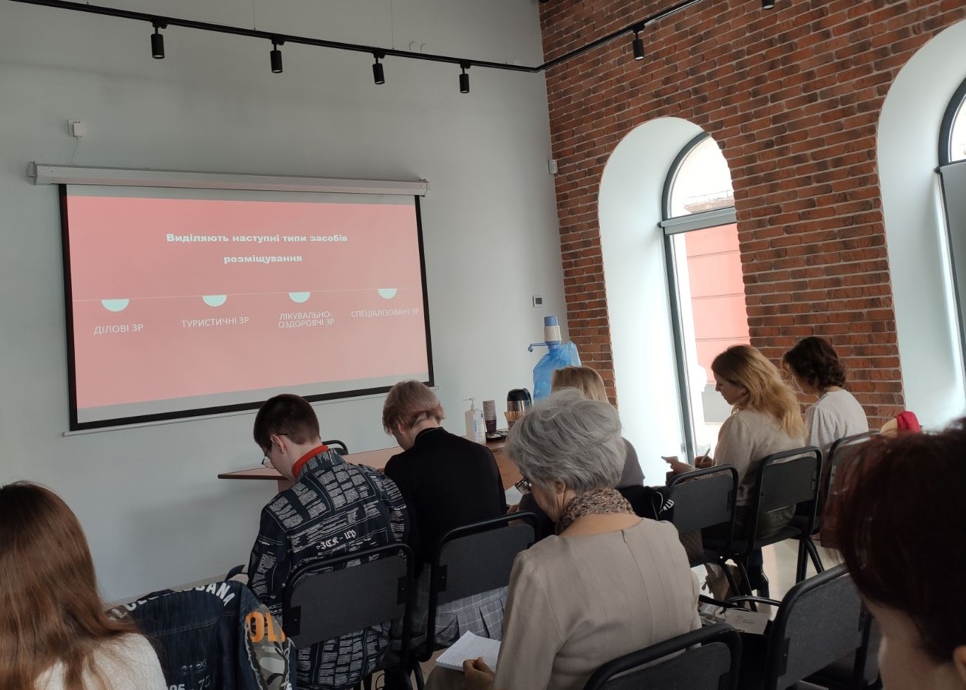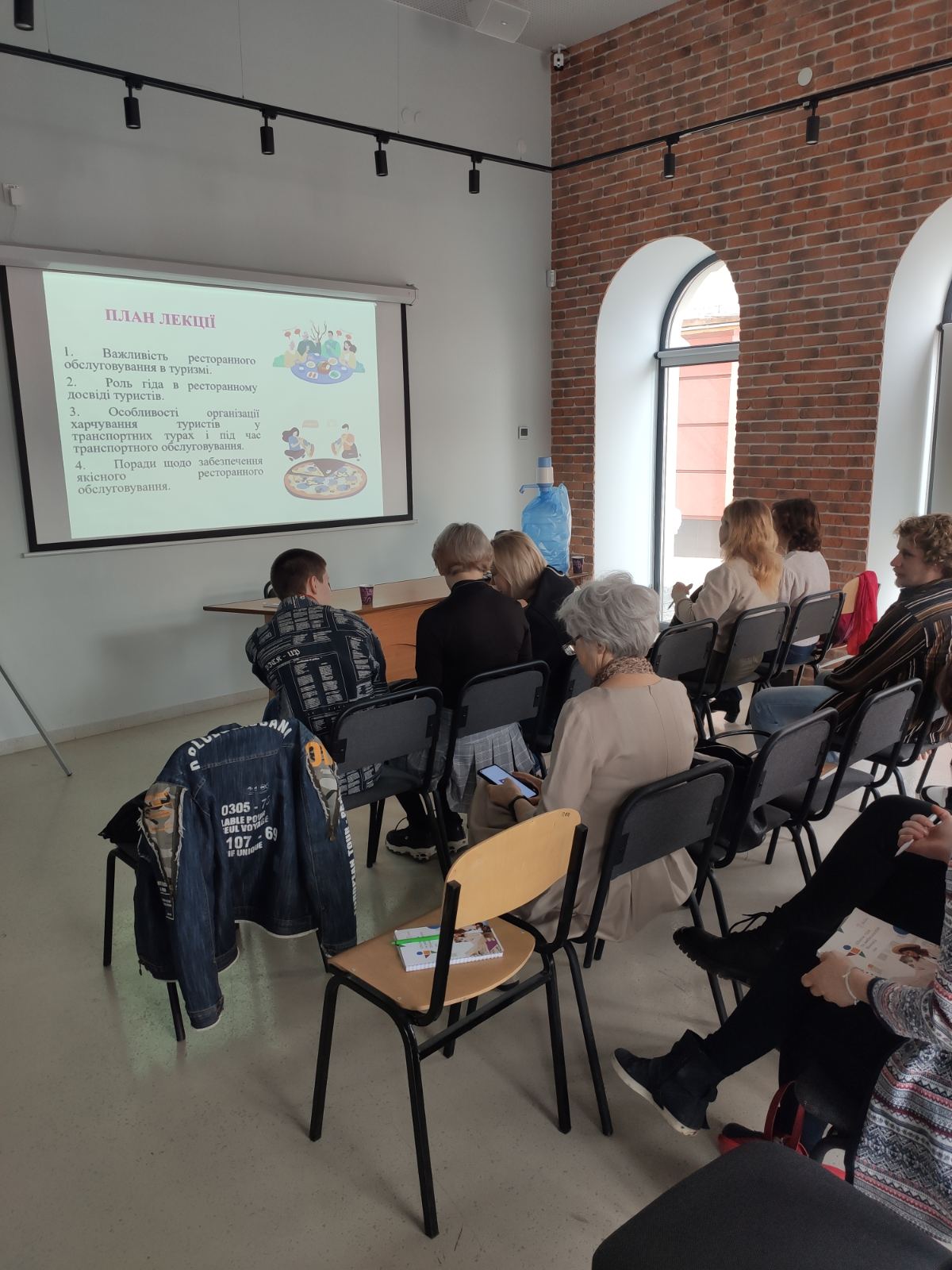Наталя Онищук виступила з лекцією на тему «Готельне обслуговування», в якій розкрила основні принципи та методи класифікації засобів розміщення, визначила загальні вимоги до засобів розміщення, розповіла типологію готелів, особливості організації надання основних послуг і додаткового сервісу в готелях, деталізувала процес вибору готелю під час розробки екскурсійних турів, а також поділилась власним досвідом вибору засобів розміщення.