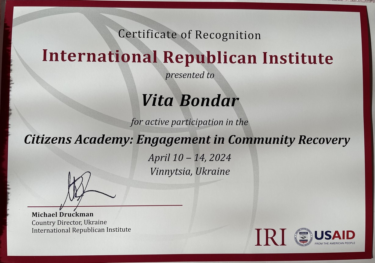 10-14 квітня 2024 року асистент кафедри менеджменту та адміністрування, представник ГО «Лабораторія суспільних змін» Віта Бондар брала участь в тренінгу «Академії громадянина: відбудова громад».