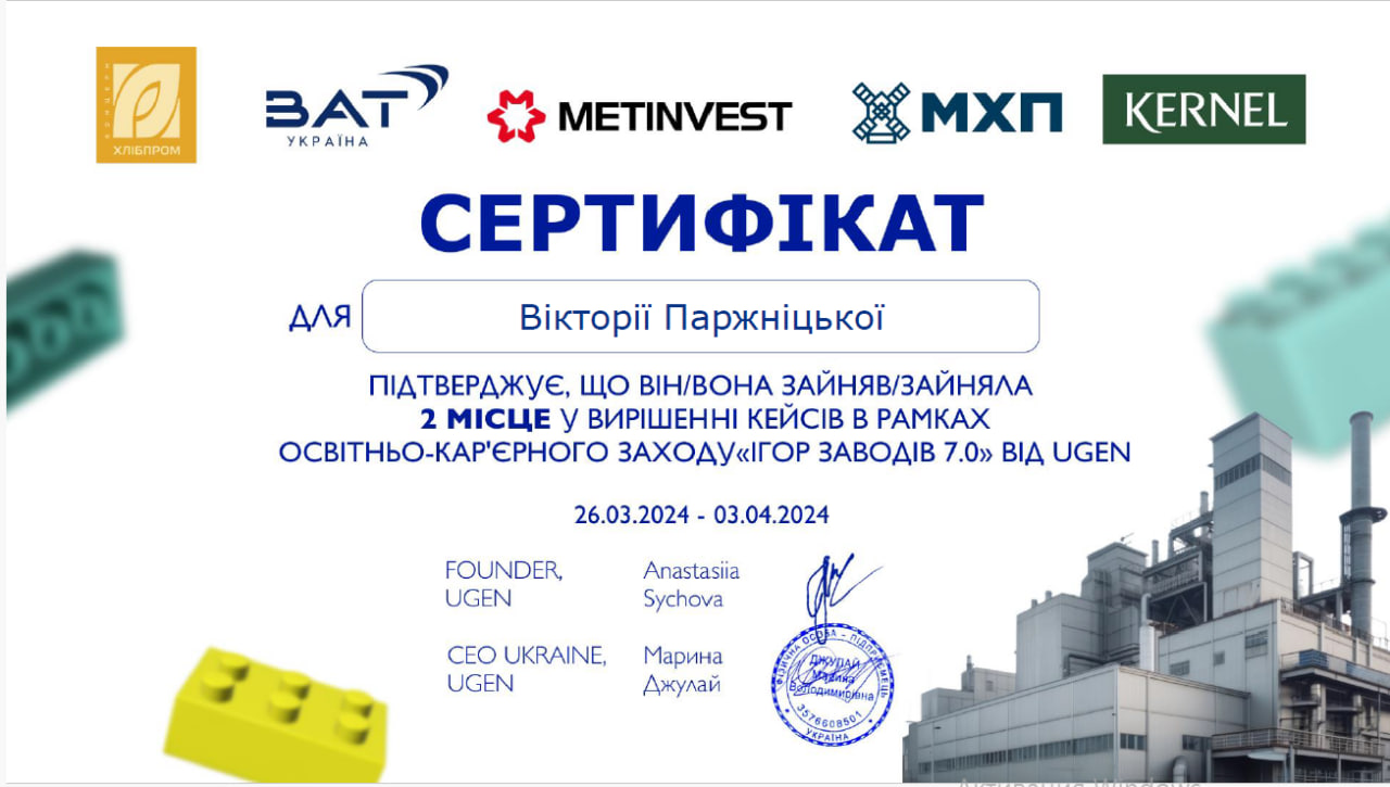 По завершенню серії вебінарів організаторами було представлено 6 захоплюючих кейсів від провідних підприємств країни, зокрема концерну Хлібпром, компаній Metinvest, BAT Україна, KERNEL та МХП. Паржніцька Вікторія у складі команди здобувачів освіти інших закладів проявила фахові знання та навички шляхом розв’язання кейсів від українських підприємств. Кожен з кейсів відкривав нові можливості та виклики для учасників конкурсу, що зробило подію захоплюючою і продуктивною для розвитку підприємницької діяльності та впровадження інновацій. Учасники-переможці отримали призи від компаній-партнерів конкурсу.