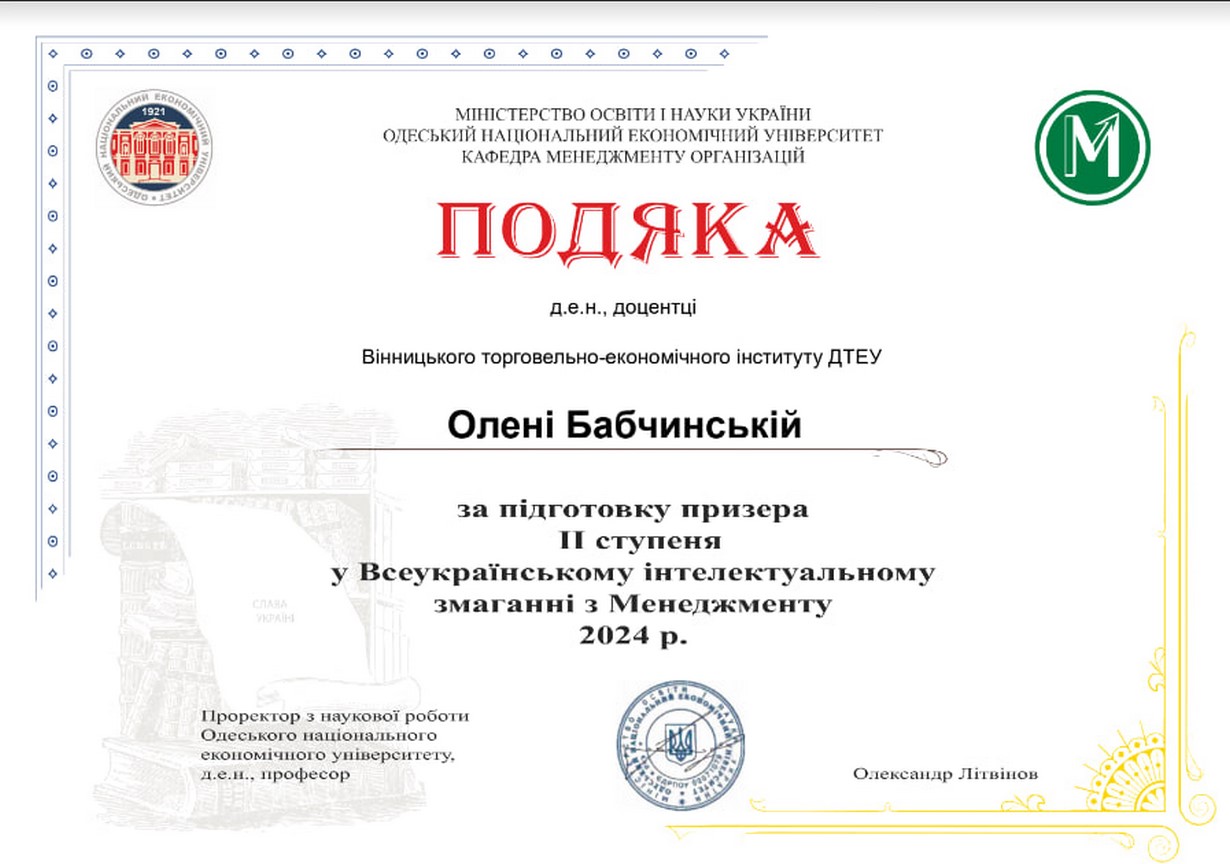 Вітаємо здобувачів вищої освіти Максима Волика (диплом I ступеня), Анастасію Гребень (диплом II ступеня), Карину Духновську (диплом II ступеня) групи М-43 та їх наукову керівницю, доктора економічних наук, доцентку кафедри менеджменту та адміністрування Олену Бабчинську, з перемогою у Всеукраїнському інтелектуальному змаганні серед студентів, які навчаються за спеціальністю 073 «Менеджмент».
