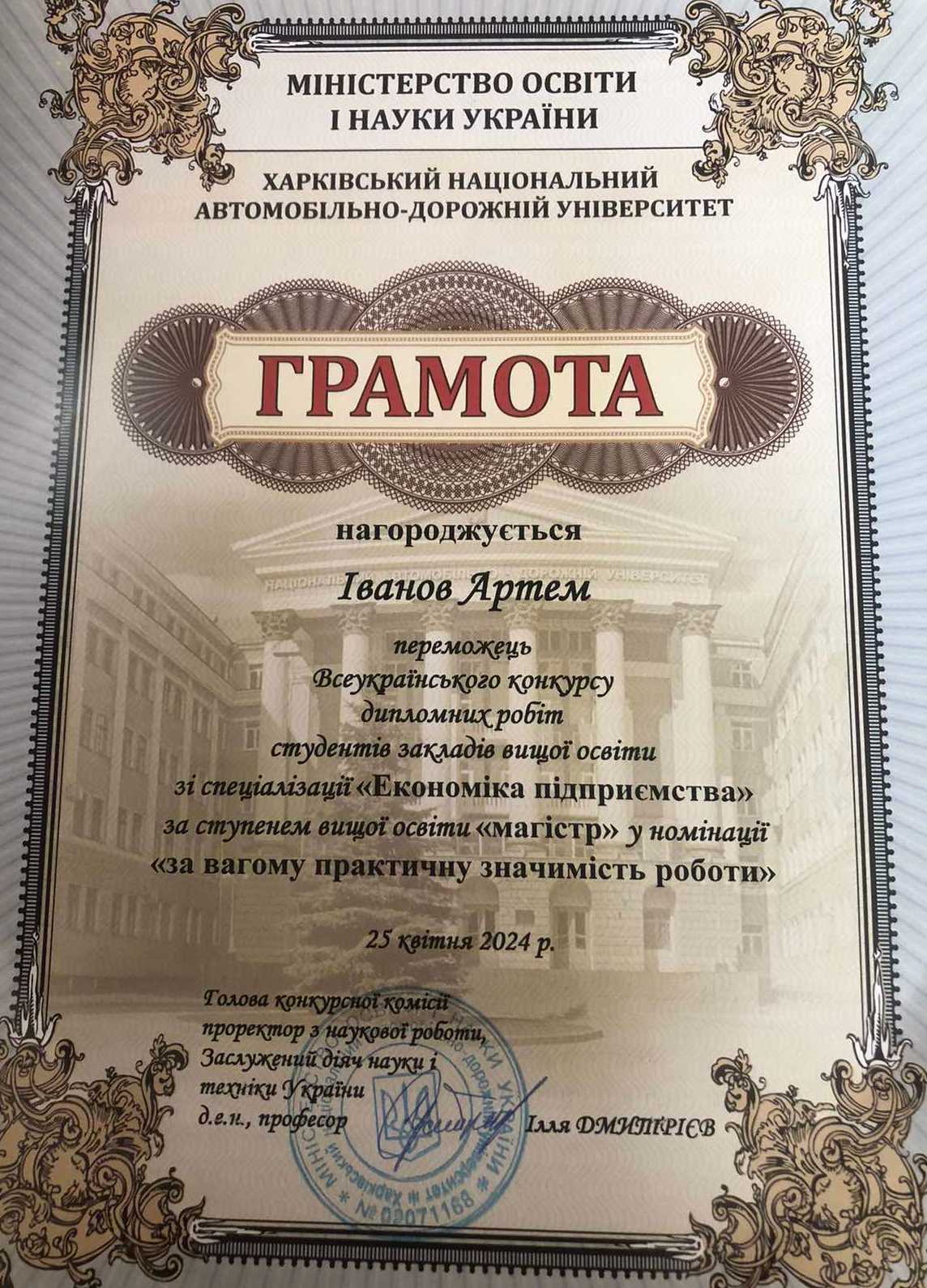 Іванов Артем нагороджений грамотою у номінації «за практичну значимість роботи».