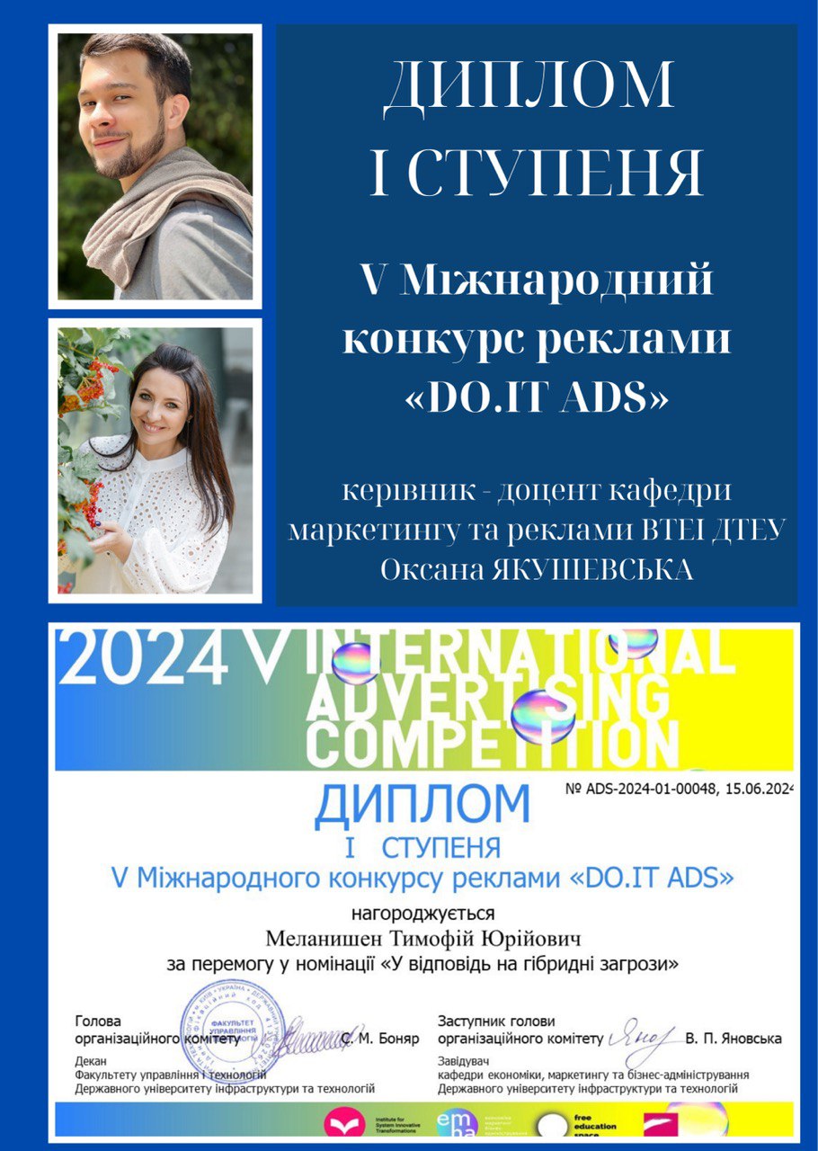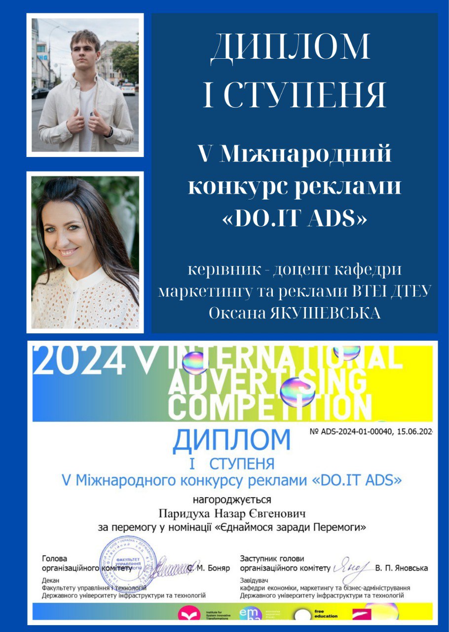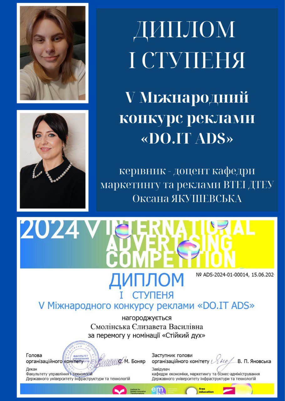 На базі Державного університету інфраструктури та технологій відбувся Міжнародний конкурс реклами «DO.IT ADS». Вітаємо наших талановитих студентів та наукового керівника – доцента кафедри маркетингу та реклами Якушевську Оксану Володимирівну, з перемогою: