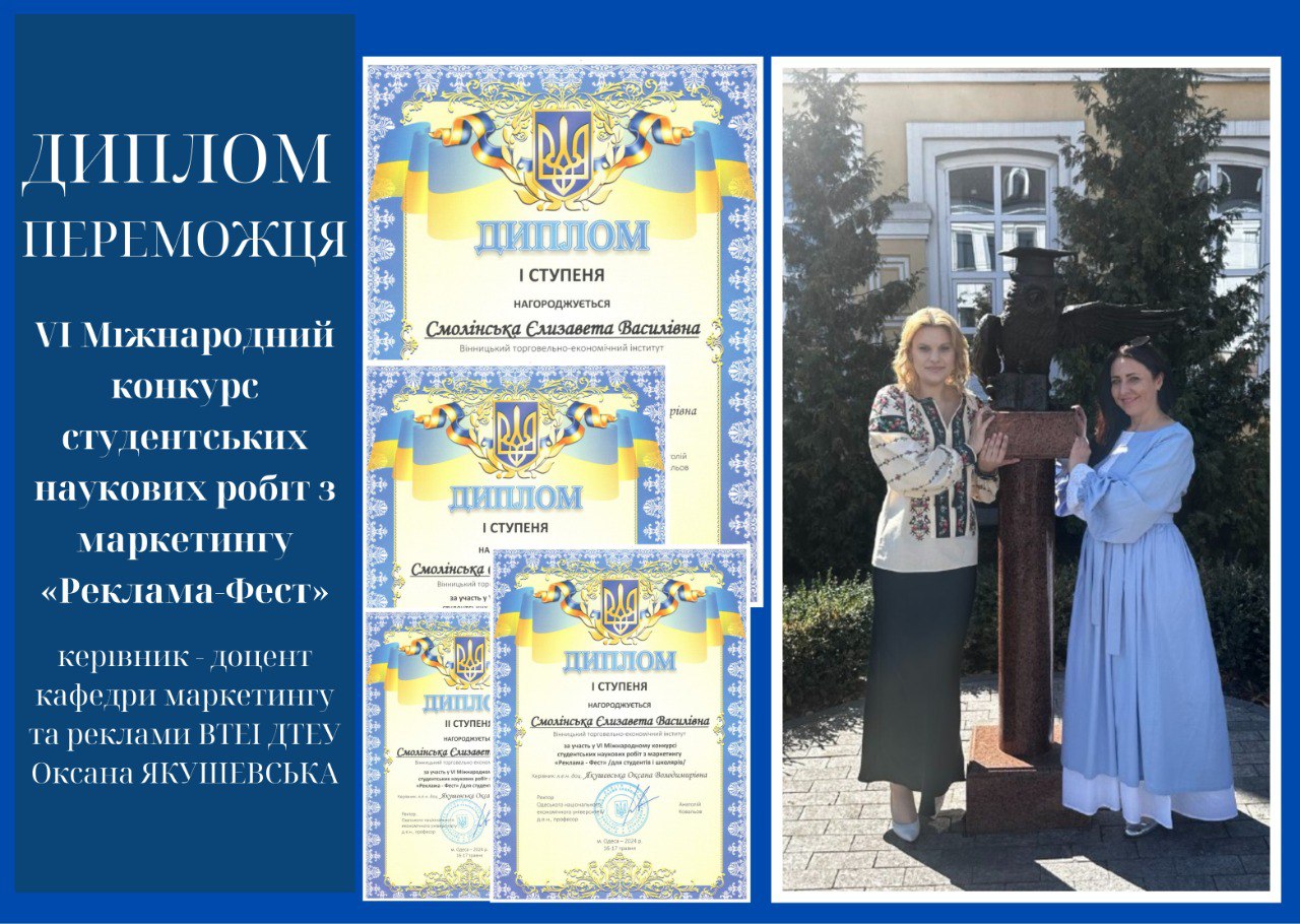 «Лимонадний ритм: Відчуй смак насолоди» та «Пекучий Світ: Відкрийте Таємниці Перчикового Вогню!»; • диплом І ступеня у номінації «Комерційна реклама» (друкована, зовнішня, сувенірна реклама і POS-матеріали) за роботу «ВТЕІ ДТЕУ – це наша Перемога» та «Обирай ВТЕІ ДТЕУ або нічого». Дякуємо організаторам Міжнародного конкурсу за чудову можливість презентувати власні дослідження, реалізувати інтелектуальні можливості творчої молоді.