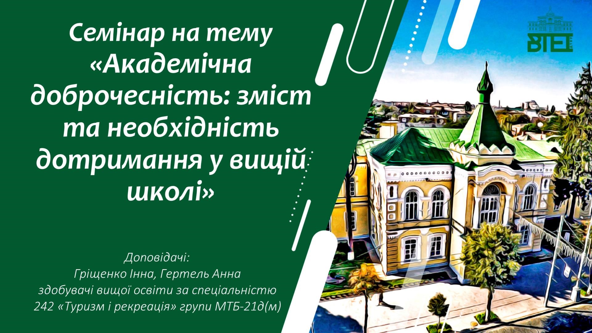 Мета заходу полягала в обґрунтуванні важливості дотримання академічної доброчесності, а також її спроможності забезпечувати підвищення рівня освіти та підготовку кваліфікованих фахівців. Спікерами на семінарі виступили Гріщенко Інна та Гертель Анна – здобувачі вищої освіти за спеціальністю 242 «Туризм і рекреація» (ОП «Міжнародний туристичний бізнес») ОС «магістр» групи МТБ-21д(м), які успішно пройшли навчання за курсом «Академічна доброчесніть у європейському освітньому та науковому просторах: багатовимірна імерсивна модель» (обсягом 150 год / 5 кредитів), організованому Сумським державним університетом у рамках виконання програми Еразмус АІСЕ. На семінарі ґрунтовного представлення зазнали такі питання, як нормативно-правове забезпечення академічної доброчесності в Україні, основні принципи академічної доброчесності та необхідність її дотримання, форми порушення академічної доброчесності та наслідки її недотримання у коротко- та довгостроковій перспективі.