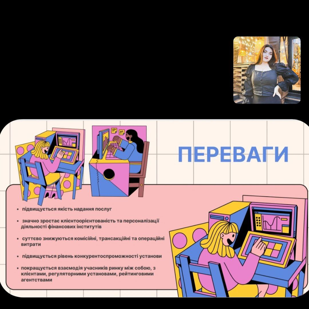 Студентка 3 курсу обрала актуальну тему «Цифровізація фінансових послуг в Україні як драйвер економічного розвитку після війни» та разом із науковим керівником Юлією Романовською провела дослідження потенціалу цифровізації у сфері фінансів. На конференції обговорили та підсумували результати наукових досліджень студентів закладів вищої освіти, що стосуються сучасних тенденцій і перспектив розвитку фінансово-кредитних систем.