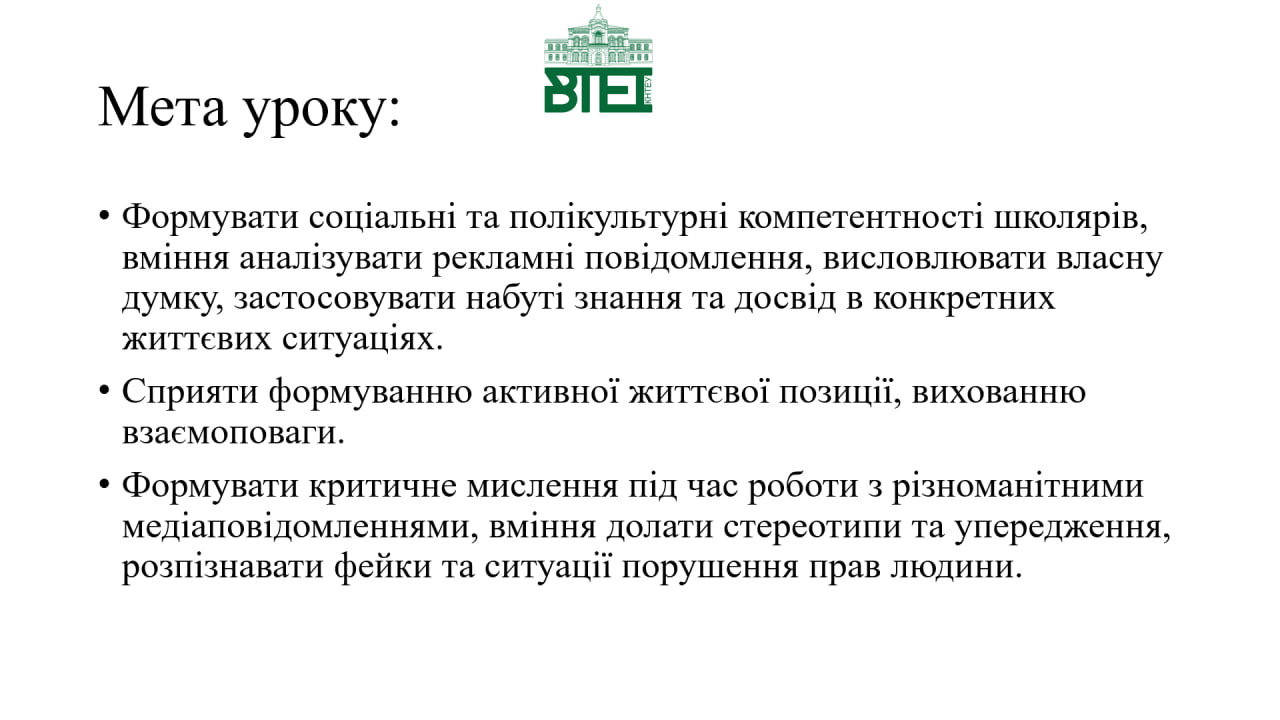 Метою заходу було формування в учнів соціальних і полікультурних компетентностей, розвиток навичок аналізу рекламних повідомлень, висловлювання власної думки, а також застосування набутого досвіду у життєвих ситуаціях. Учасники вчилися розпізнавати фейки, виявляти випадки дискримінації та порушення прав людини, долати стереотипи й упередження.