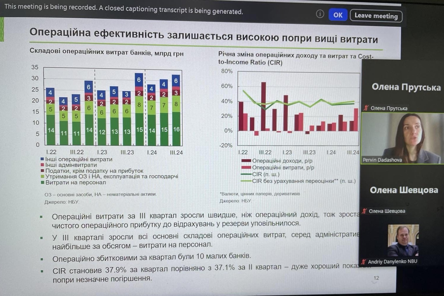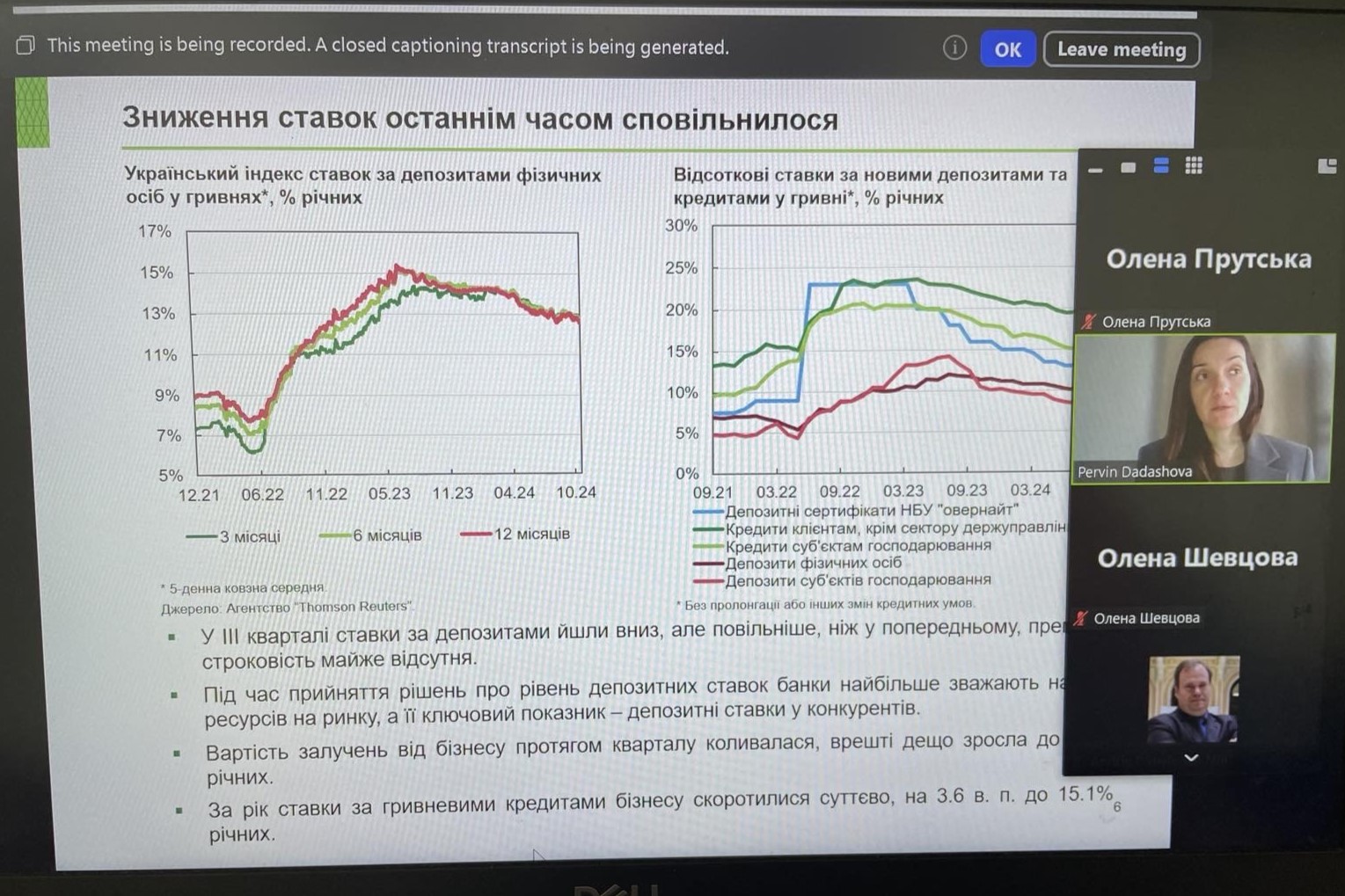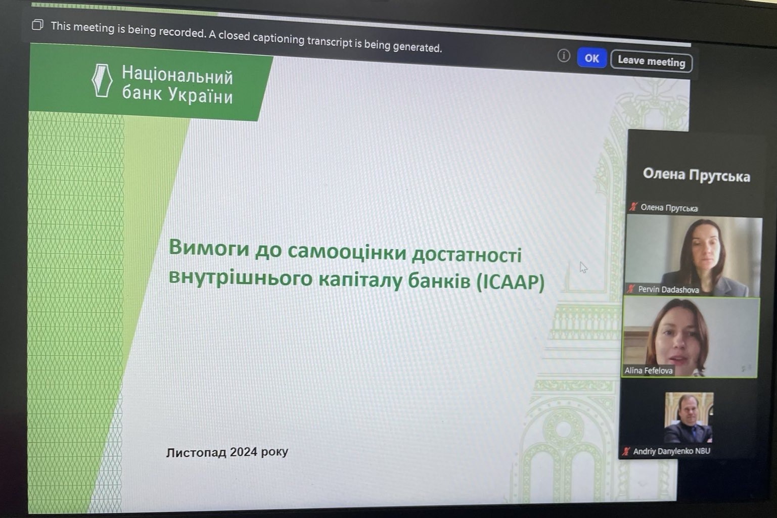 28 листопада 2024 року професор кафедри фінансів ВТЕІ ДТЕУ Олена Прутська взяла участь у семінарі НБУ «Тенденції фінансового сектору України та інструменти для управління ризиками», який відбувся у режимі відеоконференції.