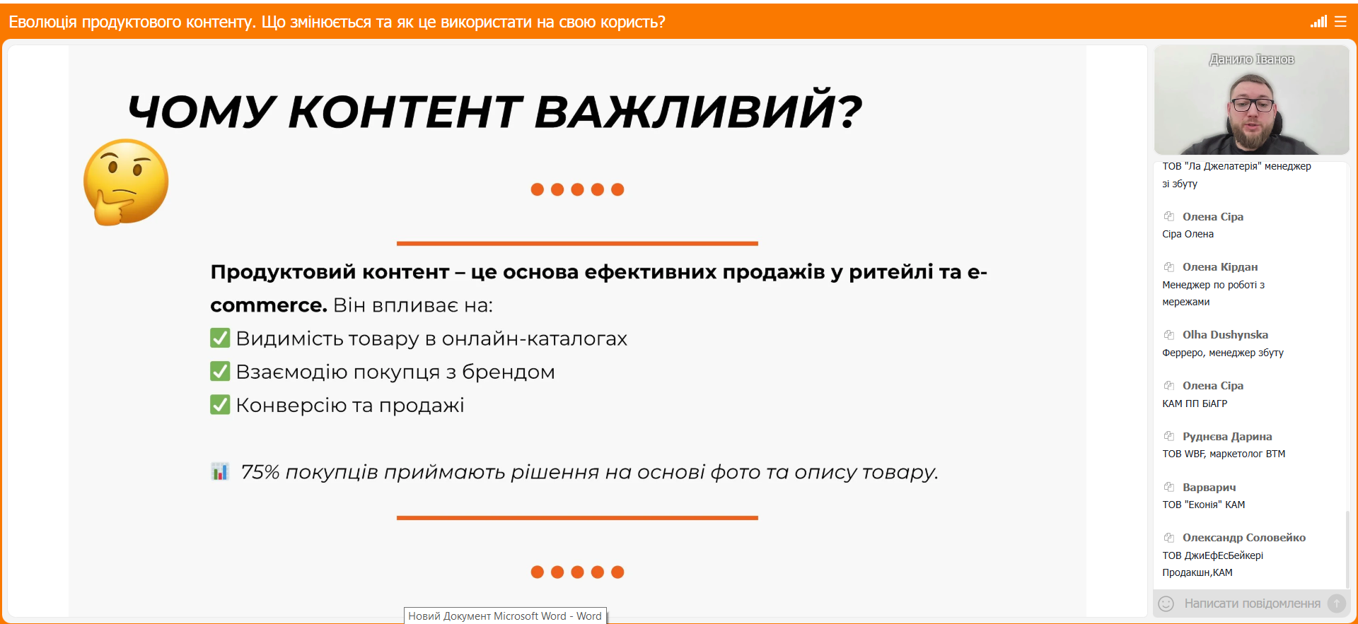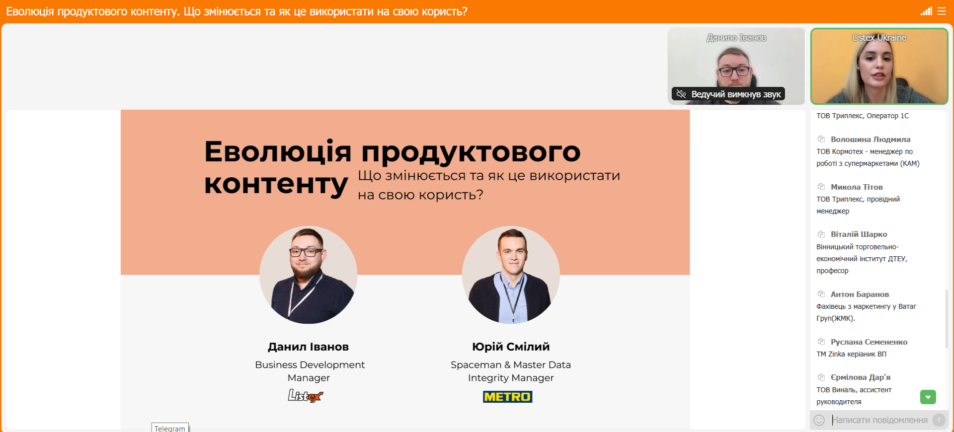 13 лютого 2025 р., професор кафедри товарознавства, експертизи та торговельного підприємництва Віталій Шарко та здобувачі вищої освіти за ОП «Підприємництво та торгівля» групи ПТ-11д (м), взяли участь у вебінарі «Еволюція продуктового контенту. Що змінюється та як це використати на свою користь?», організованим командою Listex. Спікерами виступили Данило Іванов (Business Development Manager компанії «Listex») та Юрій Смілий (Spaceman &Master Data Integrity Manager компанії «Metro»).