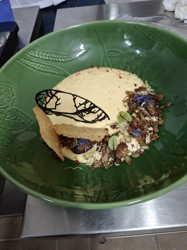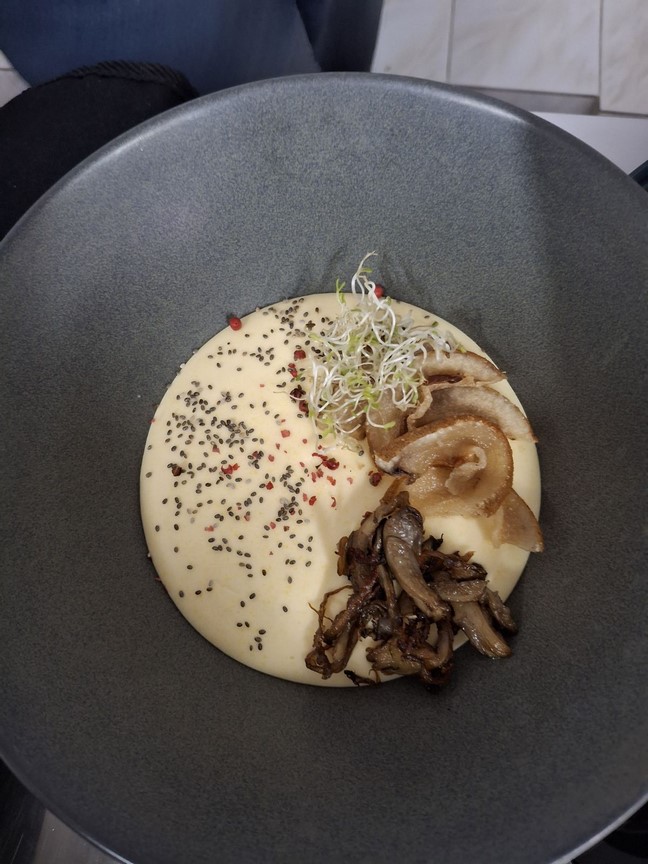 - Lola’s банош зі смаженими гливами, кранч-беконом, чіпсами з пармезану та локальною сировиною, представленою у вигляді дівочого намиста.