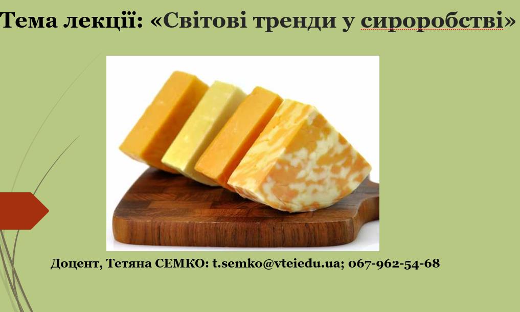 Лекційним матеріалом було охоплено широке коло питань, серед яких – класифікації сирів за різними ознаками, загальні вимоги стандарту CXS 283-1978 / Codex Alimentarius, стан та тенденції розвитку світового ринку сирів, країни-лідери у галузі виробництва сиру. Значну увагу було приділено крафтовому виробництву сирів на Вінниччині та в Україні загалом.