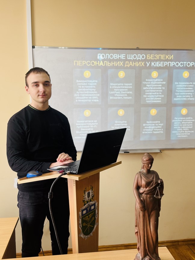 Гуртківці підготували актуальні доповіді – Ірина Богач (студентка групи ПР-32д) проаналізувала найбільш поширені кіберзлочини, які вчиняються в сучасному світі та навела статистику їх виявлення Кіберполіцією. Тетяна Витяганець (студентка групи ПР-31д) виступила з доповіддю «ТОП-10 фактів про персональні дані та кібербезпеку», в якій акцентувала увагу про підвищення правосвідомості щодо захисту персональних даних. Ростислав Карпенко (студент групи ПР-31д) надав поради як захисти себе у кіберпросторі, виступивши із доповіддю «Кіберзлочинність: як захистити себе».