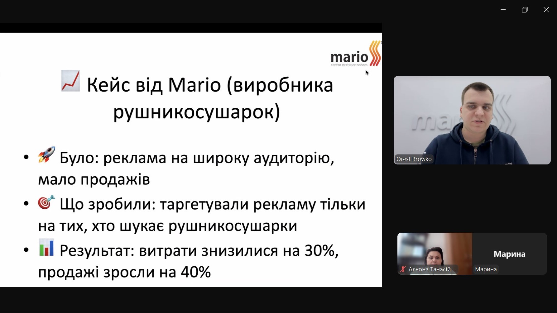 Крім теоретичної частини, Орест Бровко представив реальні кейси, що демонструють ефективність використання Google Ads та Google Аналітики в бізнесі. Це дозволило учасникам побачити практичні приклади оптимізації реклами та покращення взаємодії з аудиторією. На завершення заходу спікер поділився цінними порадами щодо початку кар'єри в digital-маркетингу, наголосивши на важливості постійного навчання, аналізу даних та тестування нових стратегій.