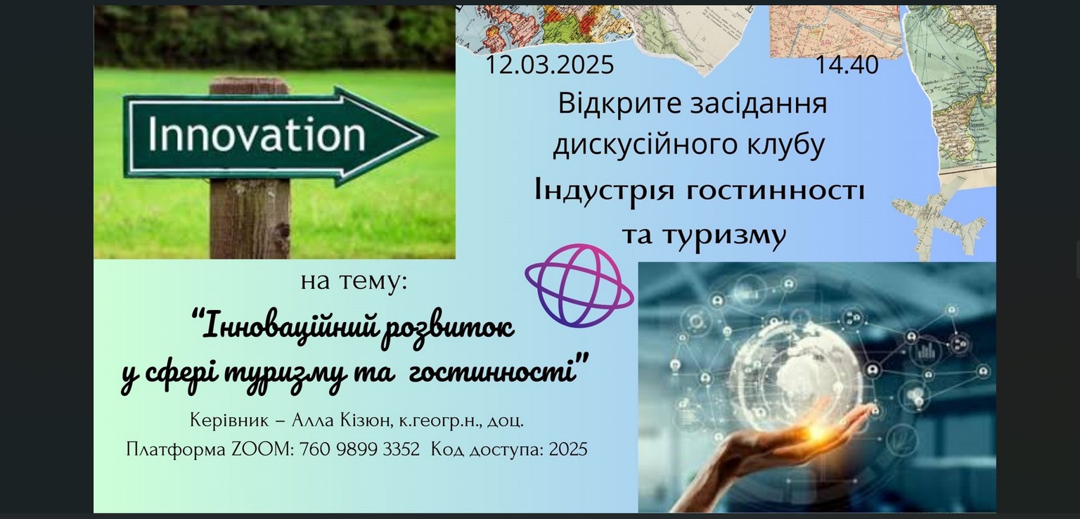12 березня 2025 року на платформі ZOOM відбулось відкрите засідання дискусійного клубу ««Індустрія туризму та гостинності» на тему «Інноваційний розвиток в сфері туризму та гостинності».
