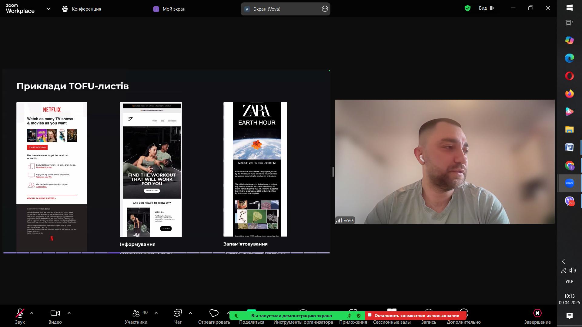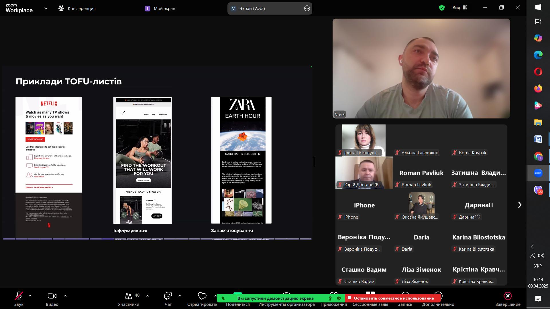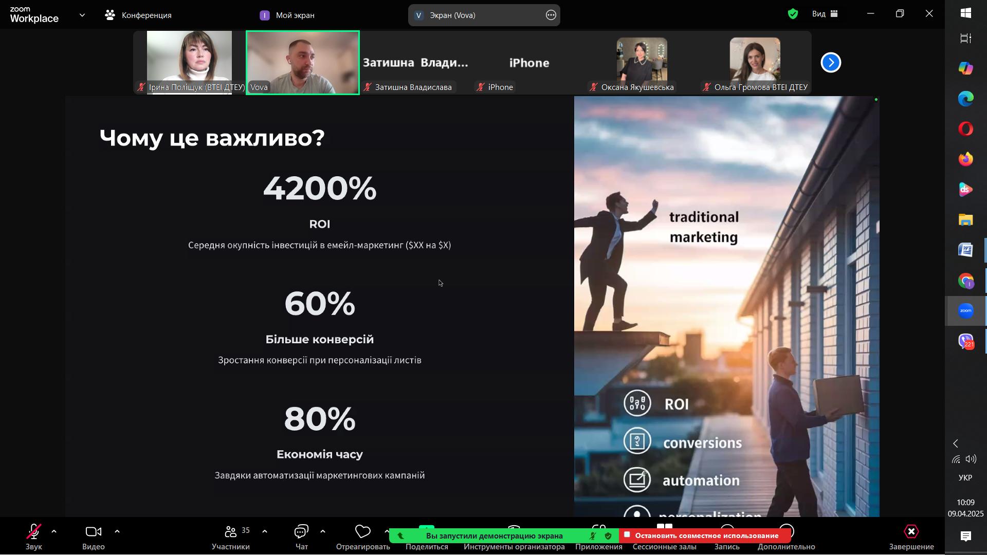 У ході гостьової лекції Володимир Бойко висвітлив такі ключові питання: типи email-розсилок і їх відповідність різним етапам воронки продажів; принципи побудови ефективної email-комунікації; важливість сегментації аудиторії та персоналізації контенту; аналіз метрик ефективності: open rate, CTR, conversion rate; роль автоматизації та CRM-систем у сучасному email-маркетингу.
