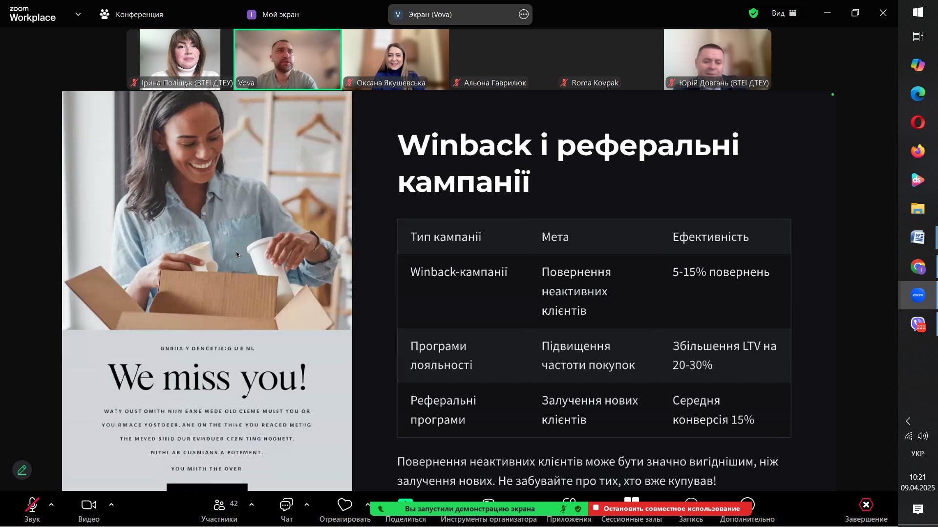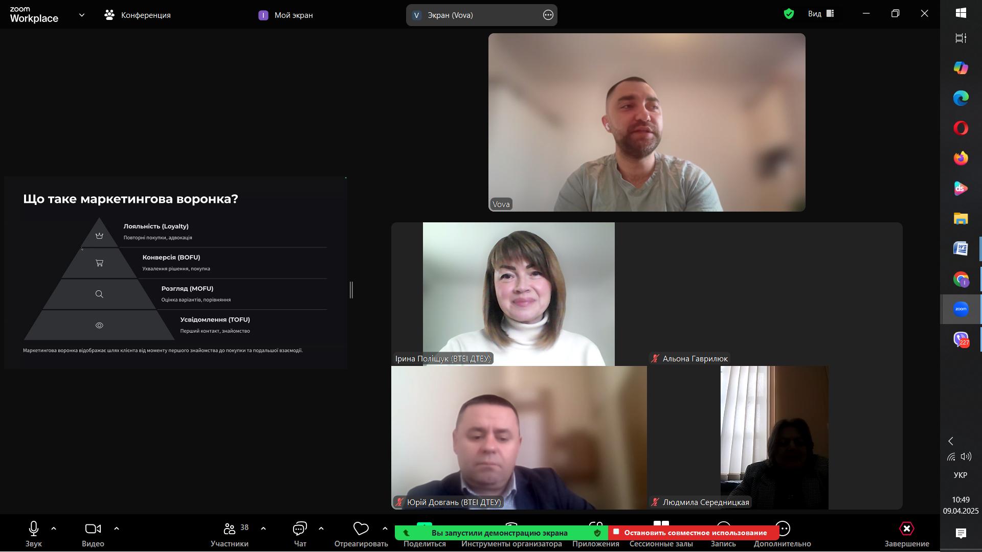 9 квітня 2025 року відбулася гостьова лекція для здобувачів вищої освіти освітніх програм «Маркетинг» та «Реклама і зв’язки з громадськістю» на тему: «Email-маркетинг у воронці продажів: роль листів на кожному етапі». Модератором заходу стала Ірина Поліщук, завідувач кафедри маркетингу та реклами ВТЕІ ДТЕУ.