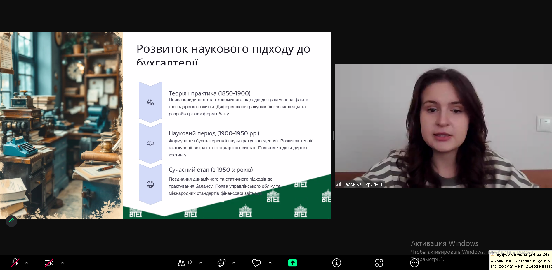 Студентка Скрипник Вероніка виступила з доповіддю на тему: «Еволюція облікових практик: від традиційних методів до цифрових технологій» у рамках роботи IV секції «Облікова політика підприємства: галузеві особливості» (науковий керівник - доцент Гладій Ірина). Представлення результатів досліджень на всеукраїнському рівні засвідчує високу якість підготовки здобувачів освіти у ВТЕІ ДТЕУ та зацікавленість студентської молоді у вирішенні сучасних викликів, що стоять перед бухгалтерською професією. Бажаємо студентам подальших успіхів, творчого натхнення та нових звершень у науковій діяльності!