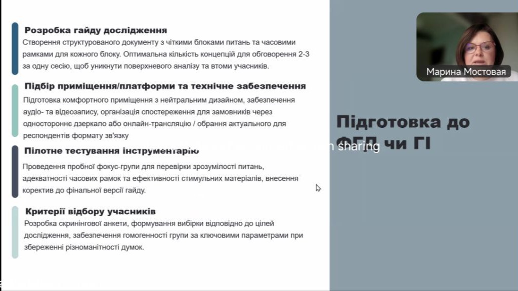 Спікерками вебінару стали Анна Падалка, кандидатка соціологічних наук і керівниця відділу соціологічних досліджень, а також Марина Мостова, керівниця відділу якісних досліджень міжнародного холдингу 4Service. Експертки поділилися реальними кейсами та практичними порадами щодо роботи з клієнтськими брифами, побудови дослідницької методології, створення гайд-сценаріїв для глибинних інтерв’ю та фокус-груп, а також організації дослідницького процесу від А до Я. Особливий акцент було зроблено на тому, коли саме якісні методи є незамінними для прийняття обґрунтованих управлінських і комунікаційних рішень.