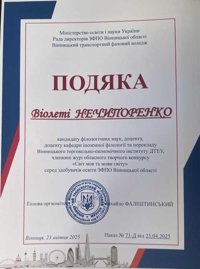 Доцент кафедри іноземної філології та перекладу Віолета Нечипоренко увійшла до складу журі обласного творчого конкурсу «Світ мов та мови світу» серед здобувачів освіти ЗФПО Вінницької області