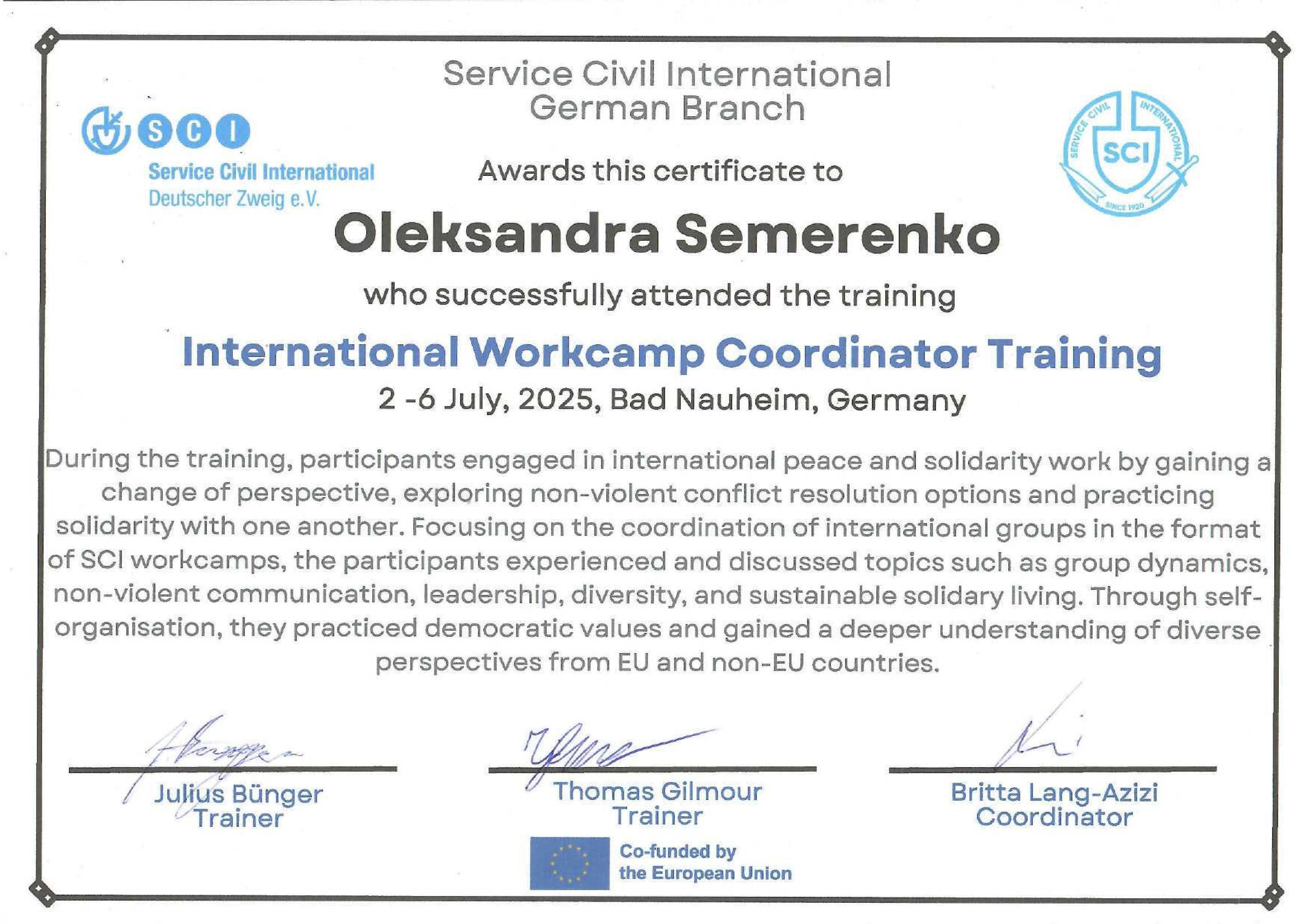 02-06 липня 2025 року здобувачі вищої освіти ВТЕІ ДТЕУ спеціальності В11 «Філологія» Анастасія Шурин, С7 «Журналістика» Олександра Семеренко та D5 «Маркетинг» Аліна Сюч взяли участь у тренінгу, який проходив у форматі табору в місті Бад Наугайм, Франкфурт-на-Майн (Німеччина). Тренінг проводився у межах програми молодіжного обміну Erasmus+ «Service Civil International Workcamp Coordinator Seminar 2025», організаторами якого були Service Civil Intemnational, German branch та ГО «Центр розвитку Пангея Ультіма».