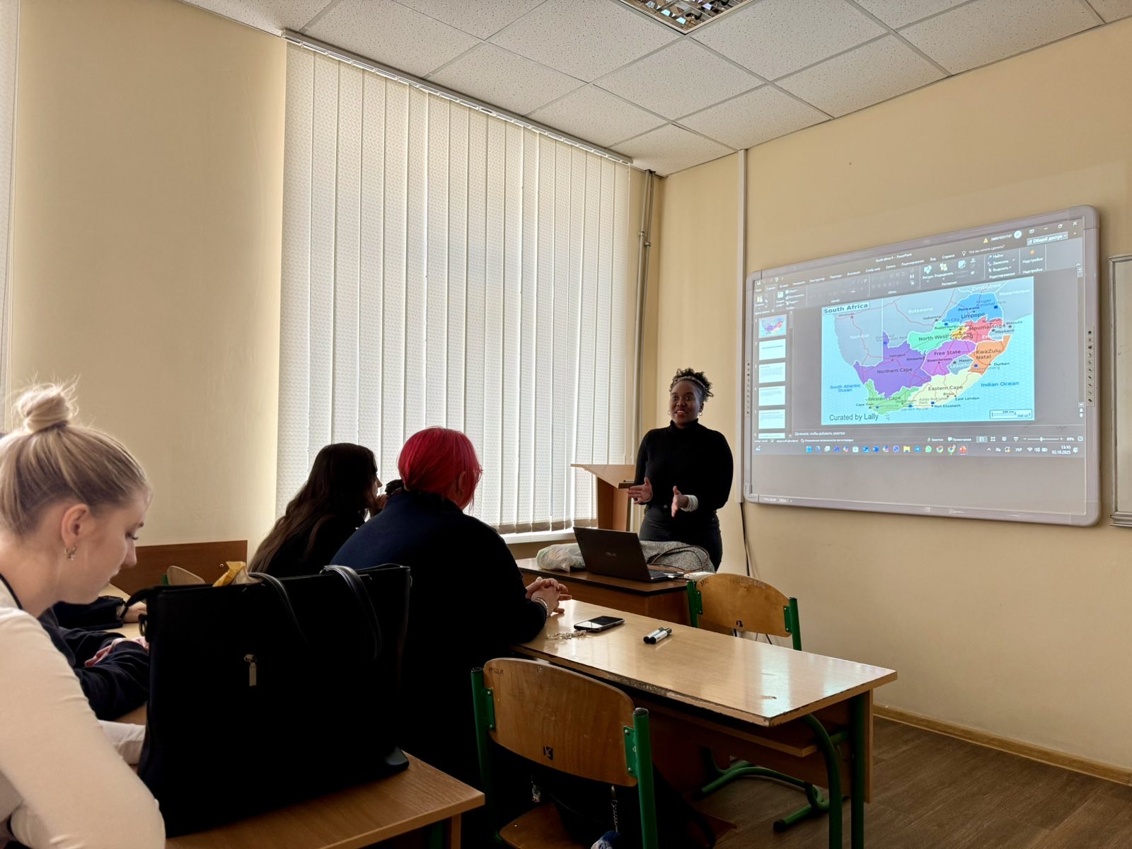 Студенти-філологи познайомилися з носієм мови, студенткою Вінницького національного медичного університету ім. М.І. Пирогова - Lally. Лелі познайомила присутніх із традиціями, звичаями та туристичними місцями її батьківщини – Південної Африки. Студенти мали змогу доторкнутися до традиційних африканських прикрас з бісеру. Філологи могли не лише вдосконалити свою вимову, але й поринути в автентичне мовне середовище, подолати мовний бар'єр і підготуватися до майбутньої професії.