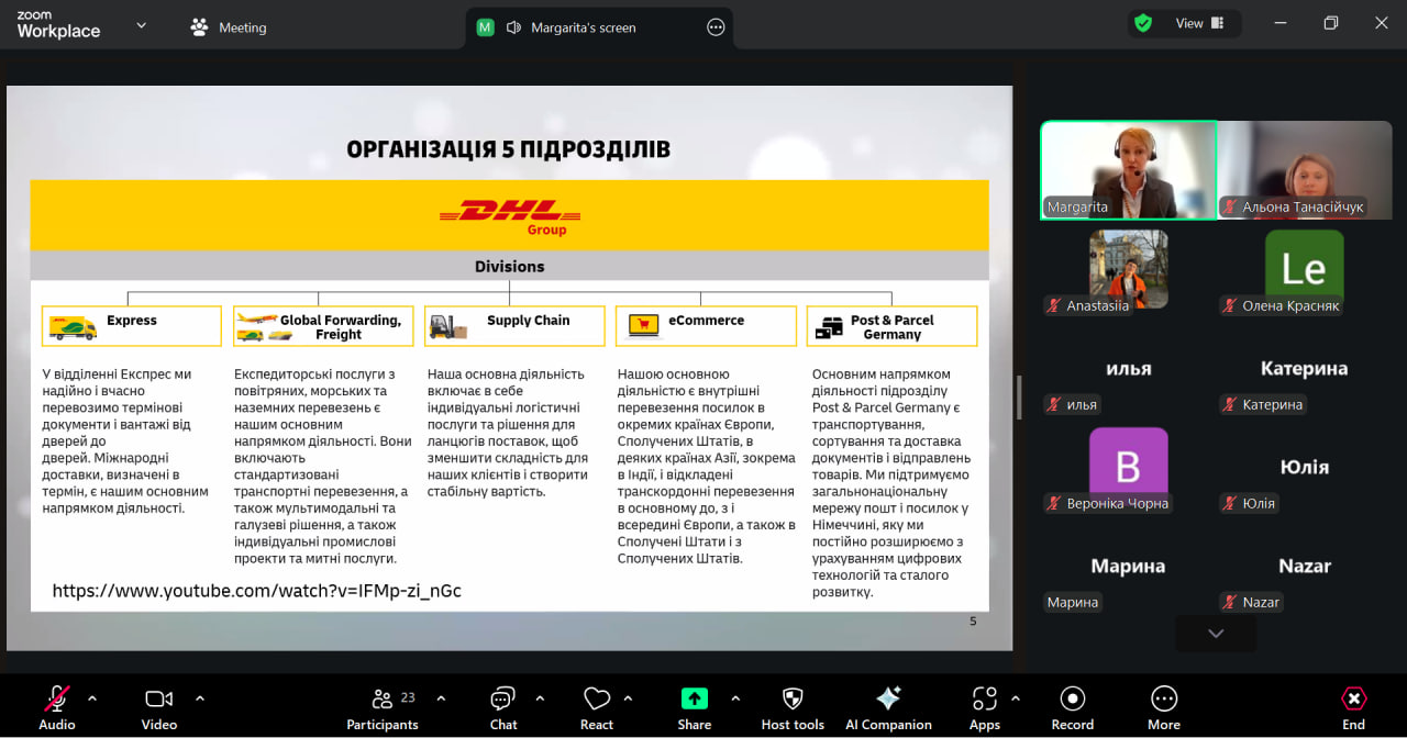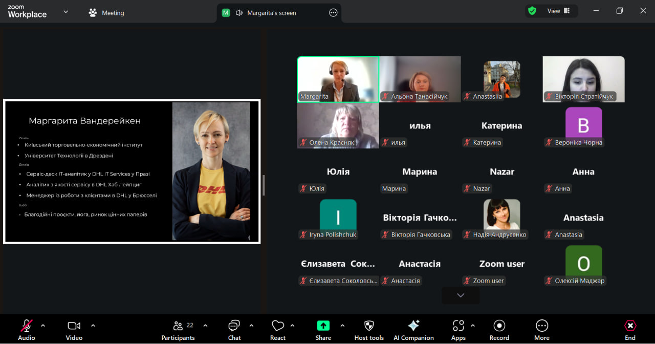 Під час зустрічі спікерка поділилася досвідом роботи у міжнародній логістичній компанії, розповіла про особливості організації клієнтських операцій у європейському підрозділі DHL Express, підходи до управління якістю сервісу та комунікації з клієнтами.
