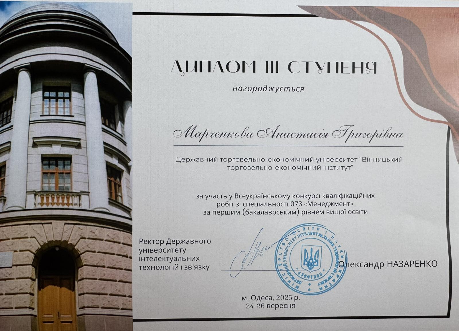 Здобувачка вищої освіти освітньої програми «Менеджмент зовнішньоекономічної діяльності» бакалаврського рівня Марченкова Анастасія під керівництвом канд. екон. наук, доцентки, завідувачки кафедри менеджменту та публічного управління Махначової Наталі здобула диплом III ступеня.